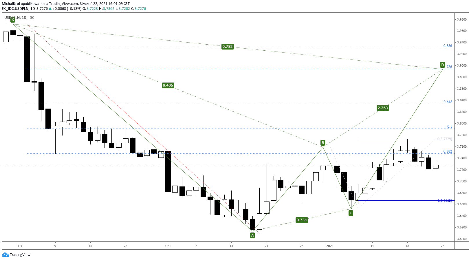 Od połowy grudnia widzimy wyraźne odreagowanie USDPLN-a. Notowania wyznaczyły dołek cenowy po kursie 3,6150. Widoczny jest też spadek zmienności oraz brak sesji kontynuacyjnych. Mimo to przygotowujemy szeroki schemat harmoniczny XABCD, którego pierwszym targetem jest pułap mierzenia 78,6% fibo. Odnosimy się tutaj do strefy cenowej 3,8950. W ujęciu lokalnym możemy wyznaczyć strefę wsparcia ~ 3,6660. Została ona wyznaczona za pomocą mierzenie FE100.