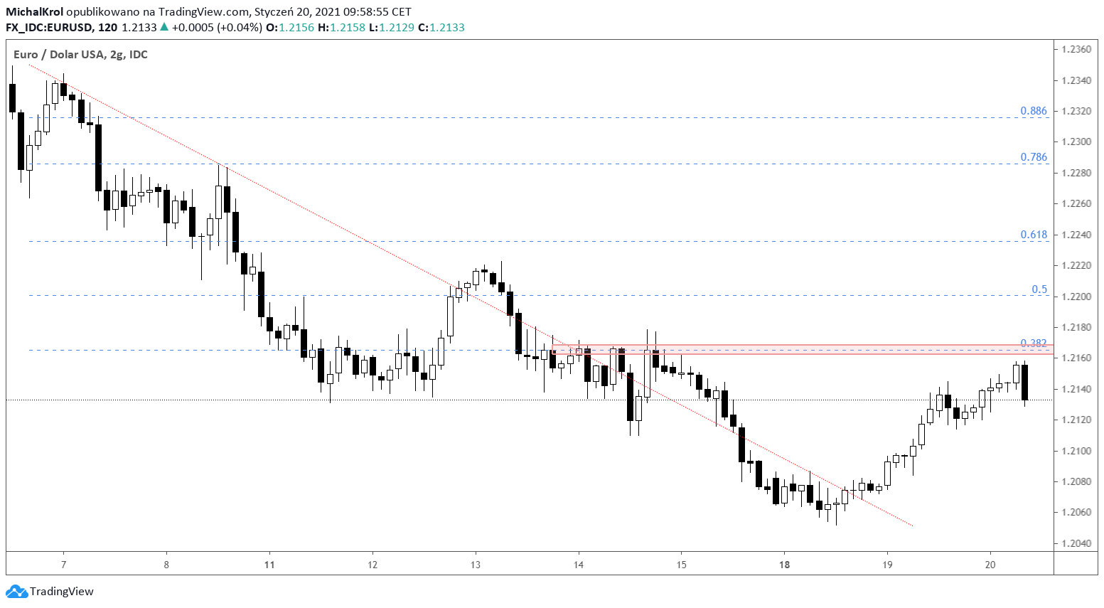 Poniedziałkowe odbicie z dużym impetem kontynuowane było do dzisiejszego otwarcia rynków kasowych w Europie. Widoczna podaż pojawiła się nieco wcześniej niż można było zakładać z technicznego punktów widzenia. Na poziomie cenowym 1,2165 mamy bowiem mierzenie Fibonacciego 38,2%. Tam też znajduje się obecna strefa oporu dla pary walutowej EURUSD.