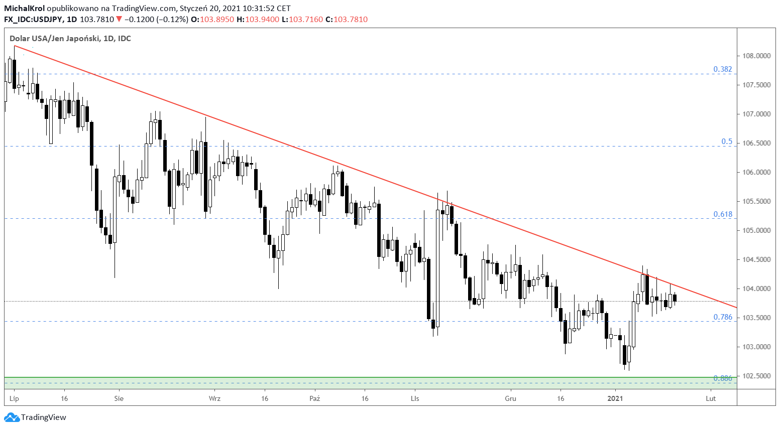 Jednym z kluczowych elementów wykresu Ujka jest poprowadzona linia trendu. Jest ona precyzyjnie respektowana przez rynek od początku drugiego kwartału 2020 roku. W ostatnich dniach kurs ponownie próbuje sforsować górne ograniczenie. Obecny pułap do wybicia to okolice okrągłego poziomu 104,00. Realny zakres dla zmienności USDJPY ciągle się zawęża, gdy weźmiemy pod uwagę strefę wsparcia 102,40.