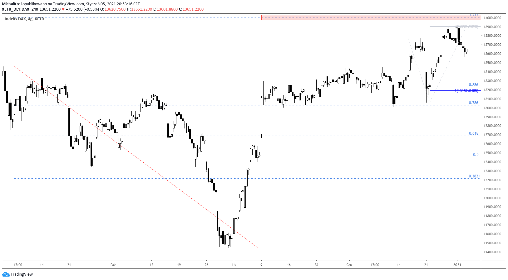 Przełom grudnia i stycznia doprowadził do ukształtowania podwójnego szczytu na wykresie 4-godzinowym. Są to zarazem wierzchołki, które wyznaczyły nowe maksima historyczne. Do osiągnięcia technicznego poziomu oporu, zabrakło nam mniej więcej 100 punktów. Sesja piątkowa upływa pod znakiem lokalnej korekty spadkowej. Jej target może sięgnąć poziomu cenowego 13200 punktów. Wynika on z korekty pędzącej AB=CD.