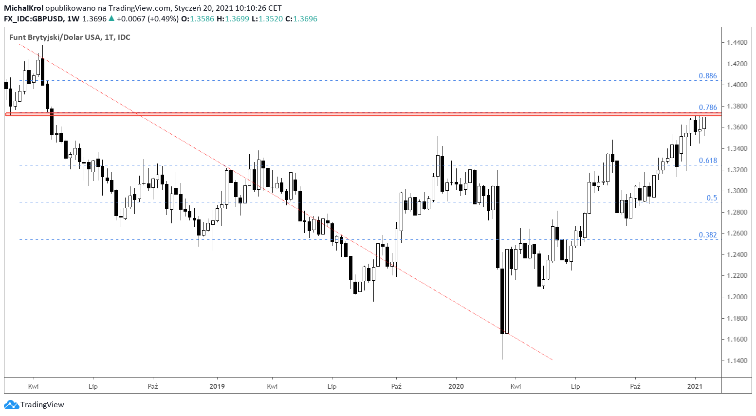 Zmiana sentymentu do amerykańskiego dolara, widoczna jest od trzech kwartałów. Średnioterminowy trend wzrostowy jest kontynuowany, ale rozpiętości korekcyjnie jeszcze się pomniejszają. Pojawiła się pierwszy sygnały, iż styczeń 2021 roku przyniesie zwrot w kierunku północnym, obecny tydzień przeczy jednak tym oczekiwaniom. Notowania wracają bowiem do strefy podażowej (1,3710), która bazuje na głębokim mierzeniu wewnętrznym 78,6% fibo.