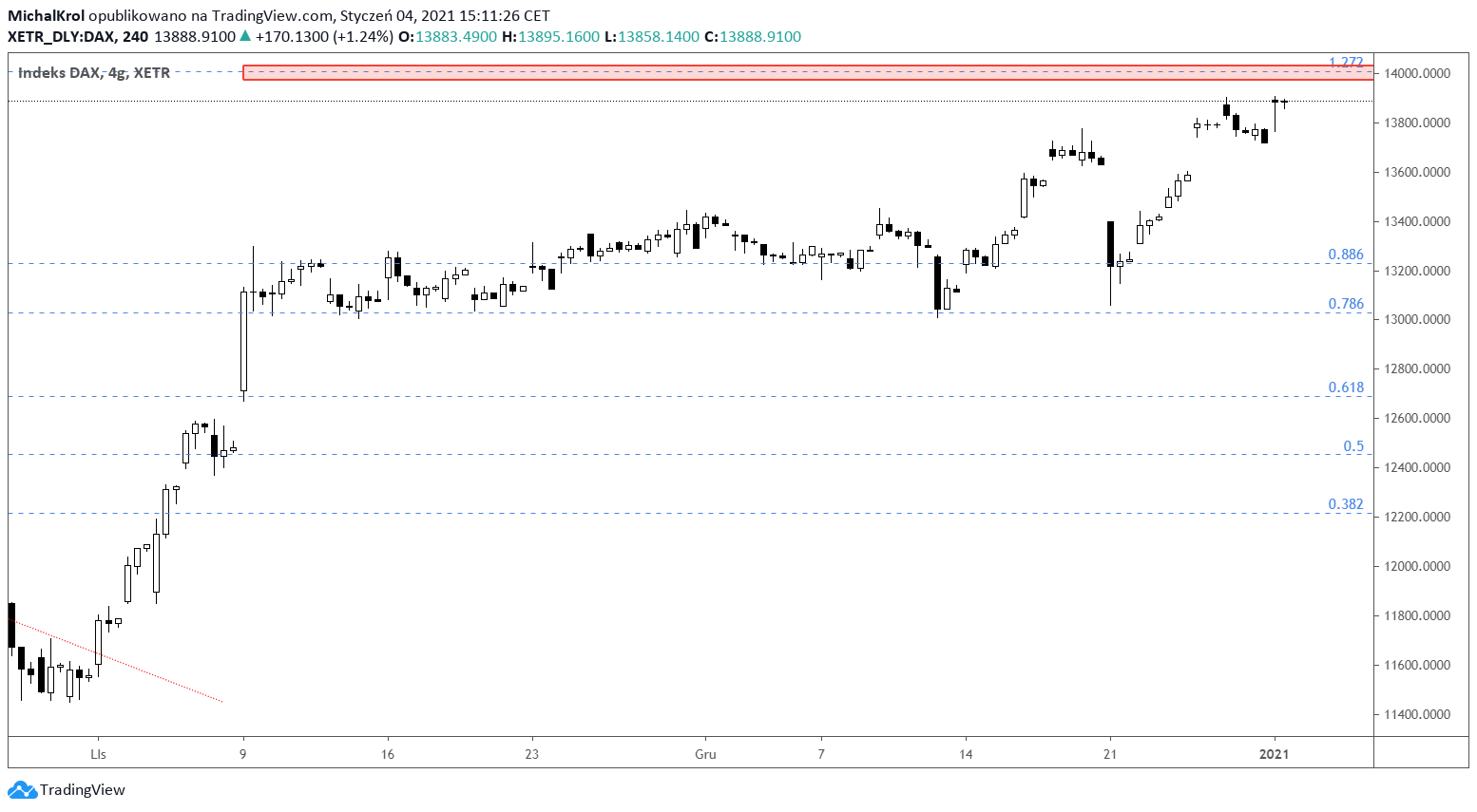 Notowania DAX-a zakończyły rok 2020 na nowych historycznych szczytach. Cena przebiła barierę 13 800 punktów i dała sygnał kontynuacji trendu wzrostowego. Otwarcie stycznia również potwierdza dominację kupujących i wskazuje na najbliższy target ~ 14 000 punktów. Jest to bowiem obecny opór średnioterminowy, który opiera się na zewnętrznym mierzeniu Fibonacciego 127,2%.