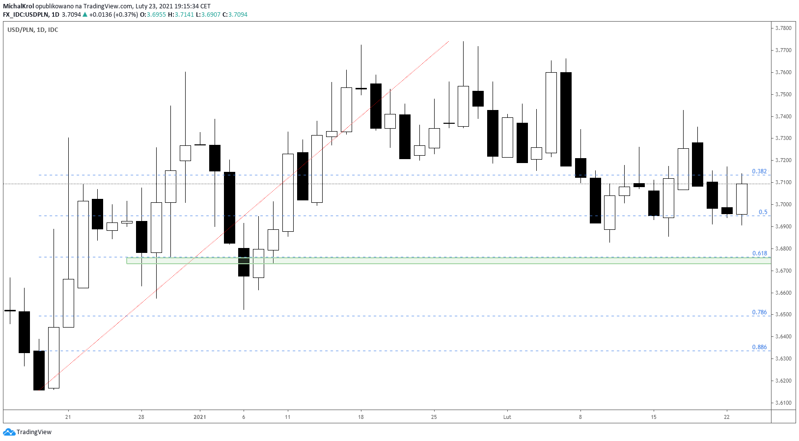 Luty na wykresie USDPLN przebiega dość spokojnie. Notowania utrzymują się poniżej bariery 3,8000 nie przełamując jednak na stałe okrągłego poziomu cenowego 3,7000. Ciekawa strefa techniczna opiera się na mierzeniu Fibonacciego 61,8%. Wsparcie odnosi się tutaj do kursu 3,6760.