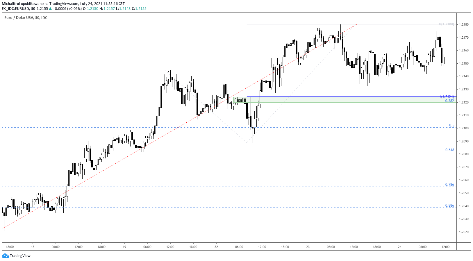 Sesja wtorkowa przyniosła wyraźne uspokojenie w trendzie wzrostowym. Na rynku EURUSD pojawiła się wyraźna konsolidacja. Rynek ukształtował górną barierę kanału na wysokości cenowej 1,2180. W przypadku dolnego ograniczenia, interesuje nas strefa popytowa przy współczynniku Fibonacciego 38,2%. Dodatkowym potwierdzeniem jest tutaj mierzenie FE100, które sąsiaduje z fibo. Analizowana strefa wsparcia to kurs 1,2120 – 1,2125.