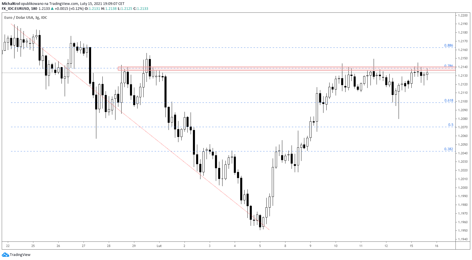 Od połowy ubiegłego tygodnia notowania Edka testują strefę podażową 1,2140. Jest to poziom oparty na głębokim mierzeniu wewnętrznym 78,6% fibo. Po piątkowej korekcie, notowania na otwarciu nowego tygodnia wracają do przedstawionego poziomu oporu. Strefa pozostaje aktualna bardziej w ramach wybicia górą i wygenerowania sygnału kupna.
