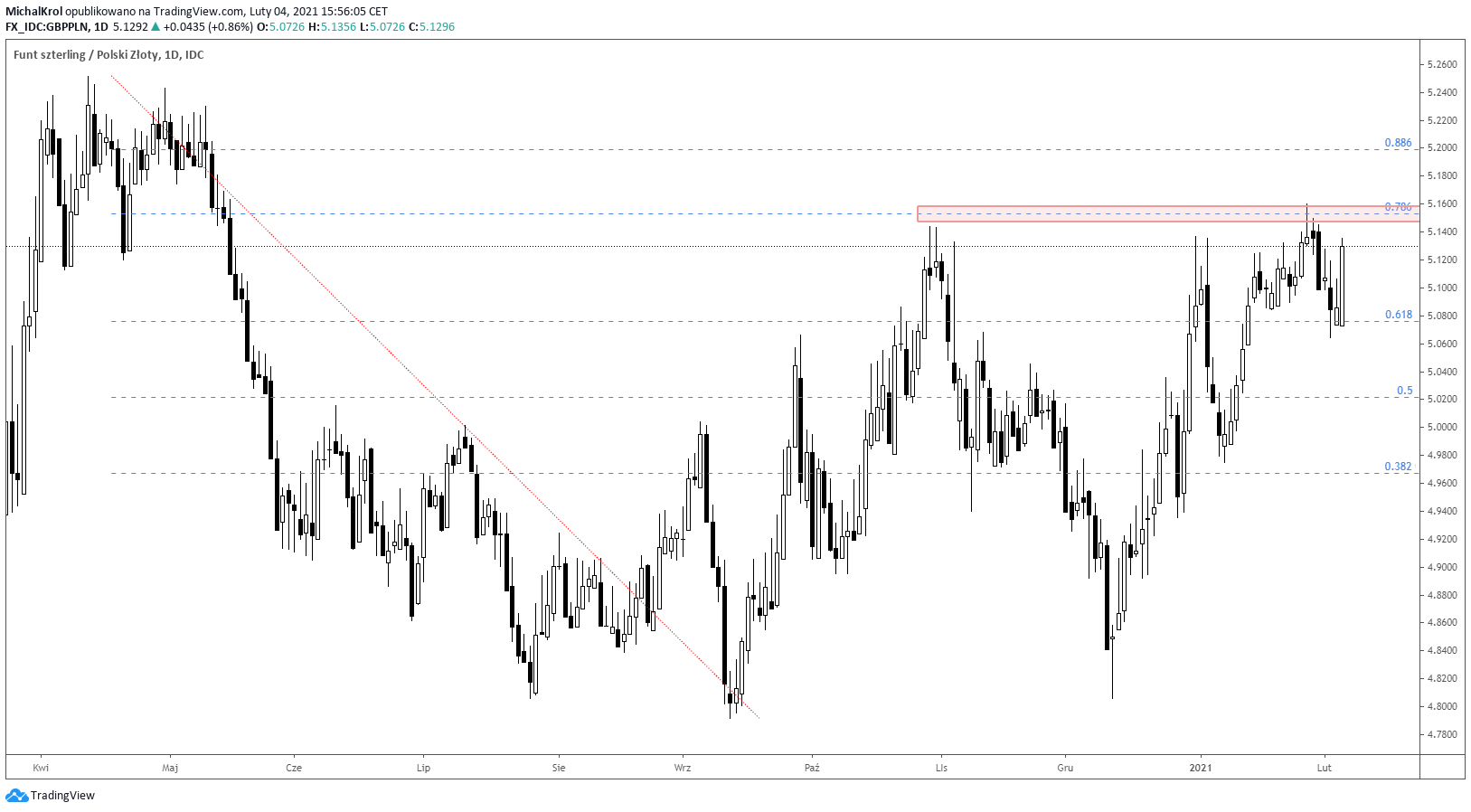 Czwartek przynosi dynamiczne wzrosty na parze walutowej GBPPLN. Dzisiejsza świeca sesyjna obejmuje obecnie około 550 pipsów wzrostu. Przybliża to notowania do szerokiej strefy podażowej 5,1500. Jest to pułap głębokiego mierzenia wewnętrznego 78,6% fibo.