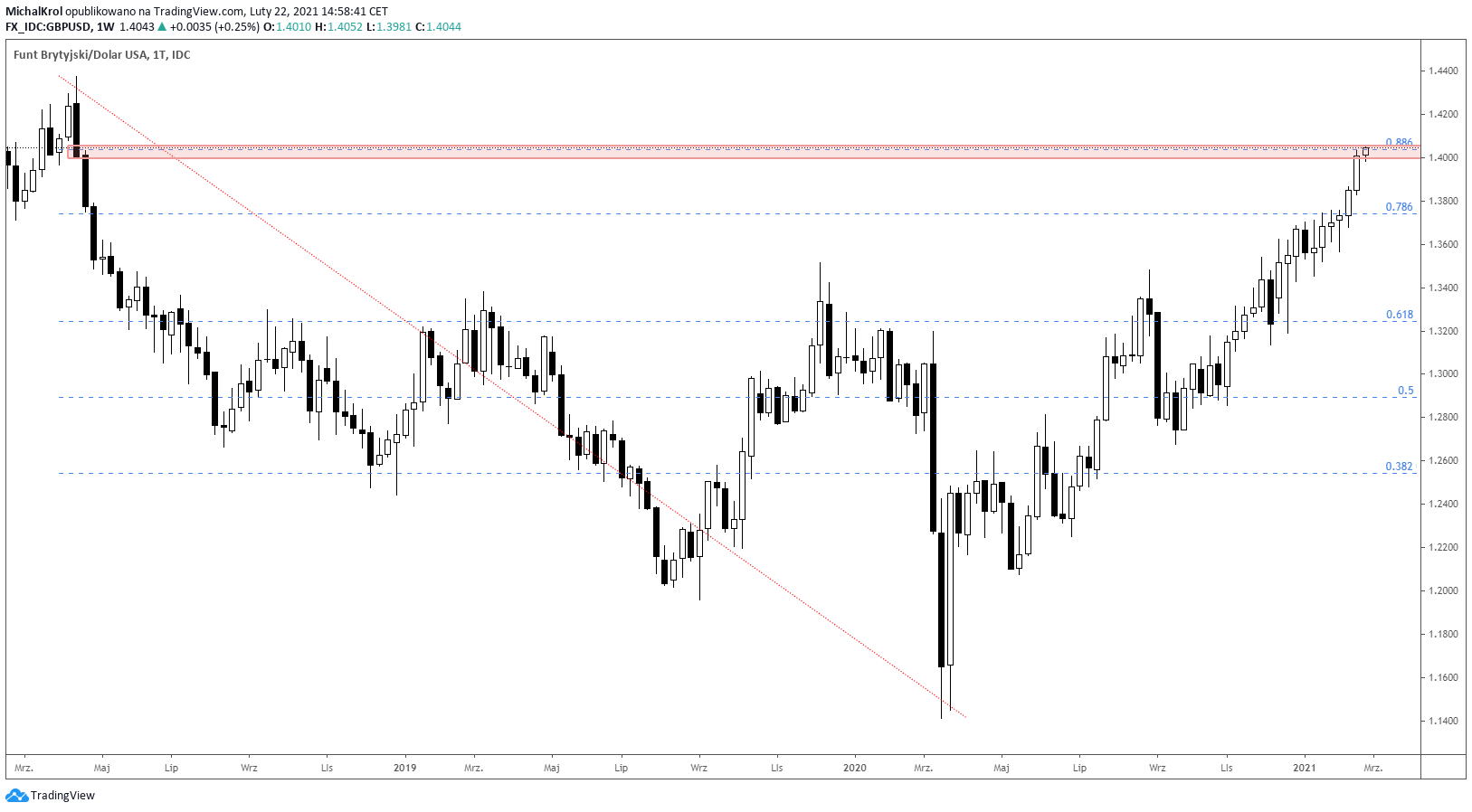 Już blisko rok utrzymują się wzrosty na parze walutowej GBPUSD. Rynek osiąga ostatnie wewnętrzne mierzenie Fibonacciego 88,6%. Jest to opór po kursie 1,4040. Obecnie obserwujemy tą szeroką strefę podażową z perspektywy interwał dziennego. Tam też należałoby szukać oznak słabości kupujących.