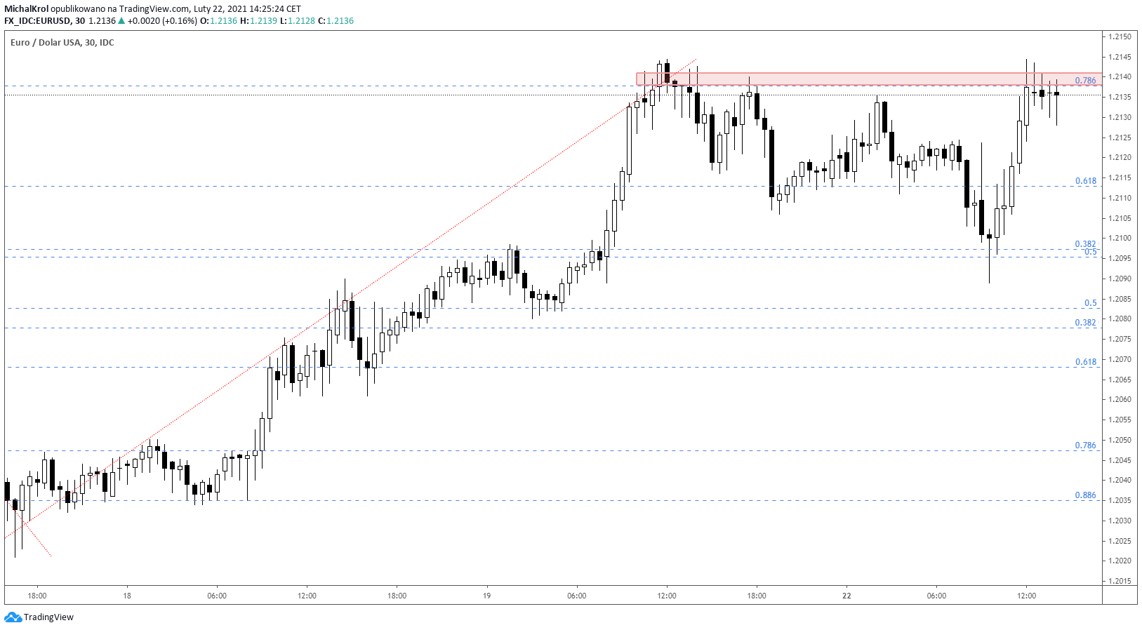 Podczas piątkowej sesji rynek ukształtował lokalny wierzchołek po cenie 1,2145. Po tym fakcie ostatnia sesja tygodnia zakończyła się realizacją zysków w gronie kupujących. Otwarcie nowego tygodnia to kolejne podejście w okolice głębokiego mierzenia wewnętrznego 78,6% fibo. Rynek wyraźnie testuje poziom cenowy 1,2140 i próbuje generować kontynuacyjne sygnały wzrostowe.