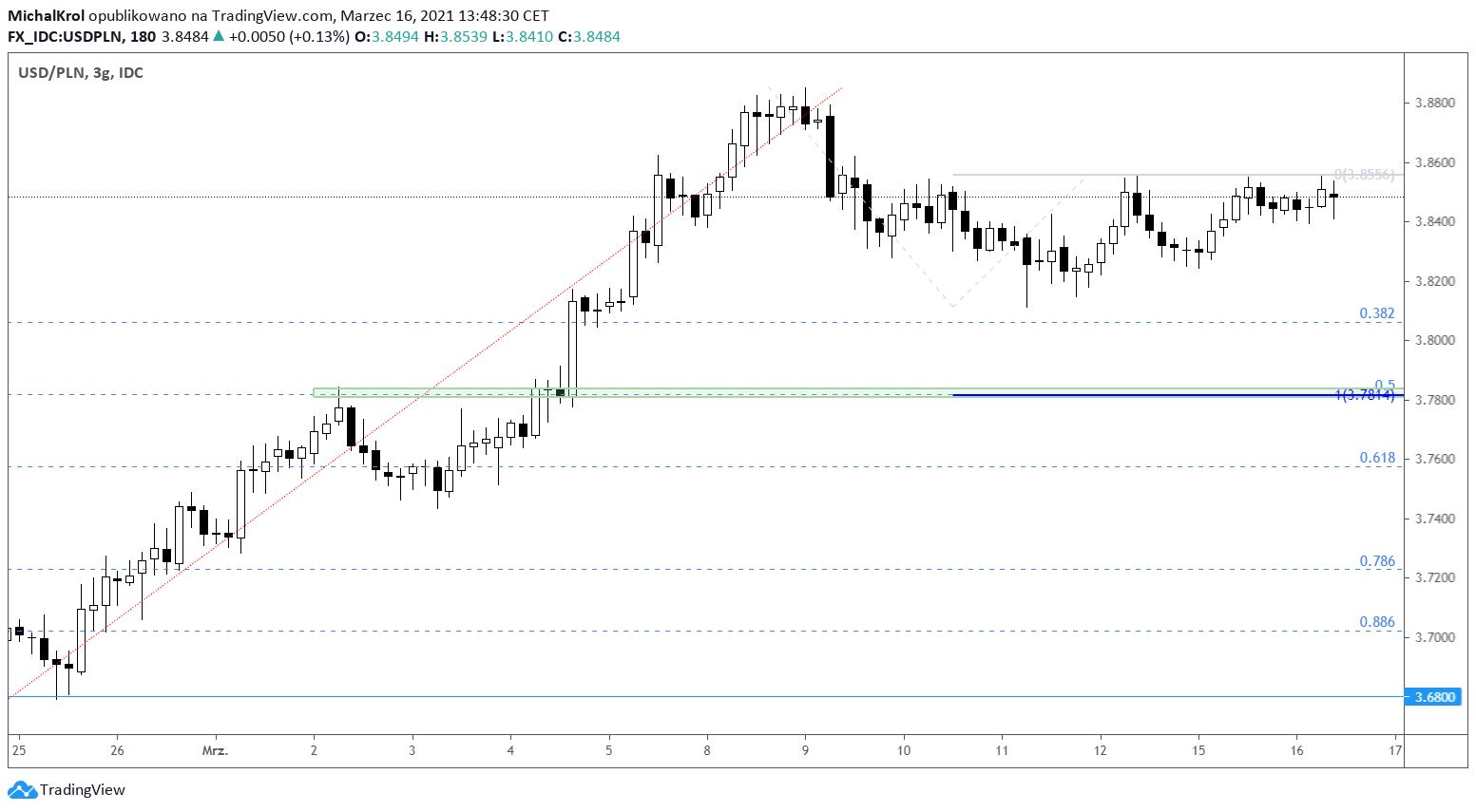 Lewa strona wykresu rozpoczyna się od dołków cenowych po kursie 3,6800. Ostatni tydzień lutego upłynął jednak pod znakiem wyraźnej dominacji amerykańskiej waluty. Widoczny swing wzrostowy kształtowany był bowiem na przełomie lutego i marca.