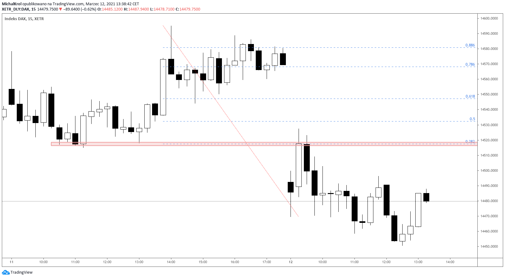 Rynek kasowy na DAXie wystartował dziś z wyraźną luką spadkową. Notowania wyznaczyły lokalne dzienne low po cenie 14 450 punktów. Od mniej więcej południa kurs wykonał zwrot w kierunku północnym. Techniczną strefą oporu jest poziom cenowy 14 518 punktów. Mamy tam mierzenie Fibonacciego 38,2% oraz wyraźną biegunowość.