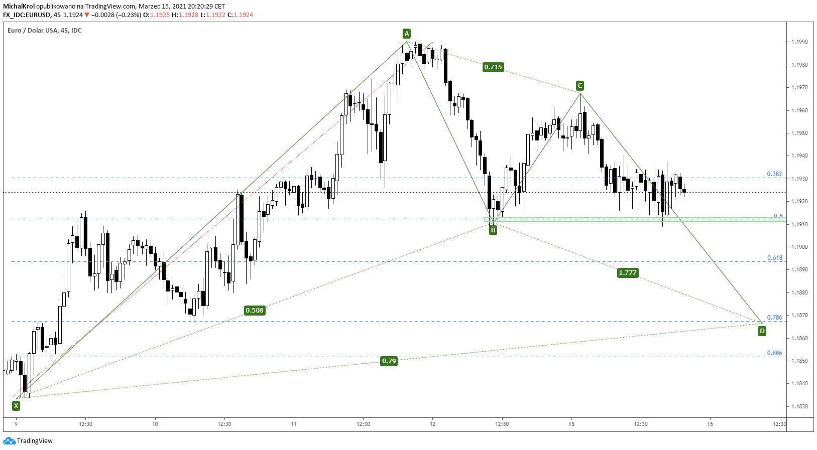Kluczowym poziomem na głównej parze walutowej pozostaje strefa popytowa 1,1912. Bazuje ona na mierzeniu 50% wspomnianego swingu wzrostowego z ubiegłego tygodnia. Ukształtowanie dołka na przełomie biegunowości, powinno być elementem scenariusza harmonicznego. Zakładając punkt B na wysokości mierzenia 50%, wypełnieniem układu powinien być pułap głębokiego współczynnika 78,6% fibo po kursie 1,1867.