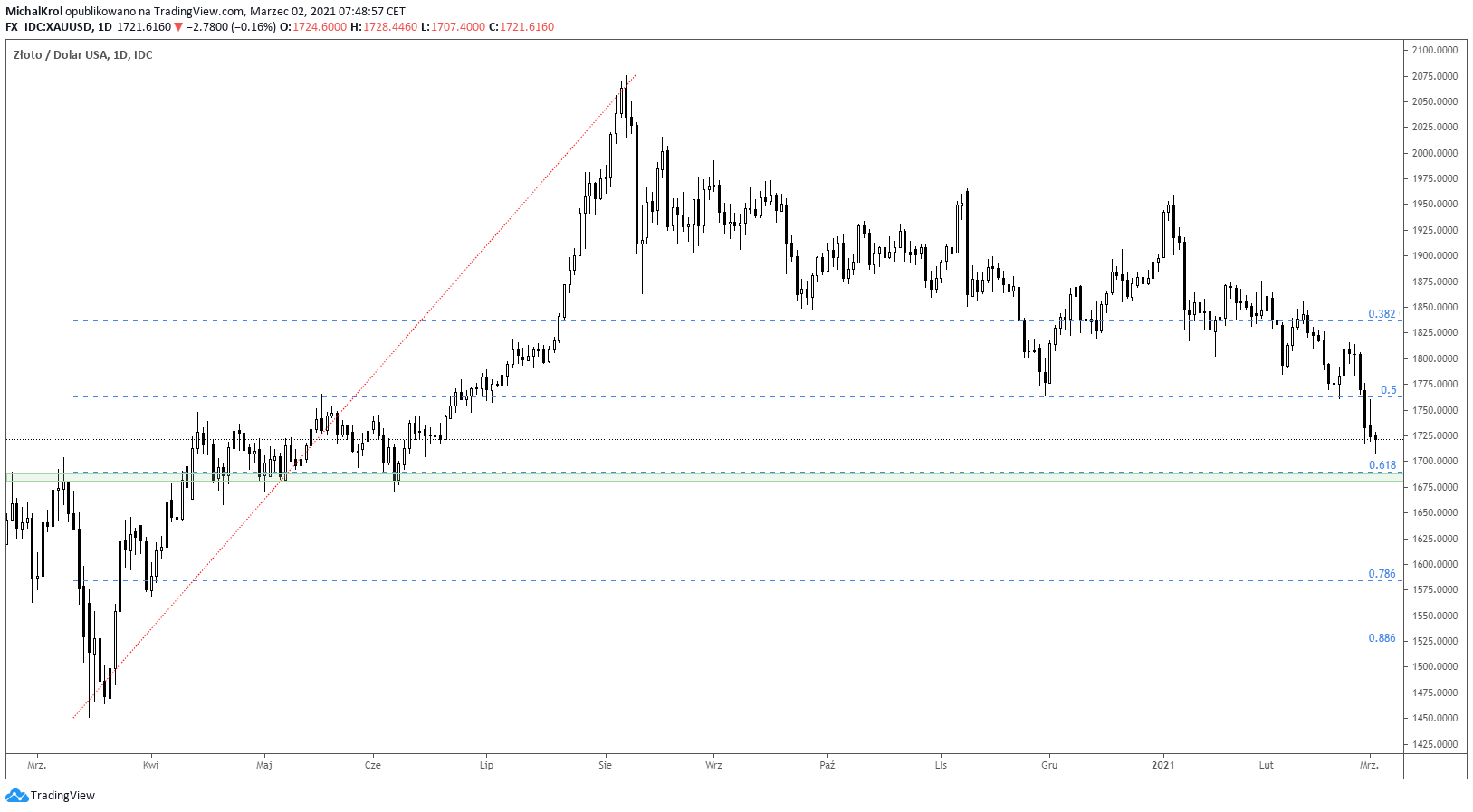 Rok 2021 rozpoczął się od kontynuacji przeceny na metalach szlachetnych. Notowania już dawno zapomniały o wycenie przekraczającej 2 000 dolarów, która została przekroczona w drugim kwartale ubiegłego roku. Obecnie rynek zbliża się do szerokiej strefy popytowej, która oparta jest na współczynniku Fibonacciego 61,8%. Odnosimy się tutaj do poziomu cenowego 1 690 dolarów za uncję. Potwierdzeniem dla wskazanej strefy jest wyraźna biegunowość ukształtowana wiosną 2020.