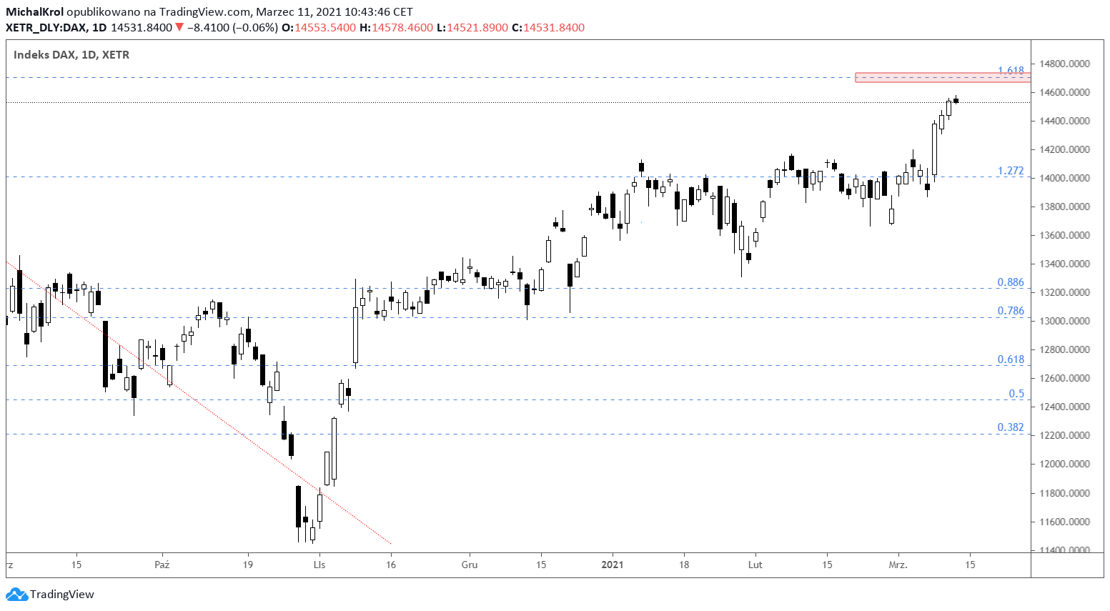 W związku z ostatnich dynamiką wzrostową na niemieckim DAXie, warto mieć na uwadze kolejne targety cenowe. Korzystamy tutaj z zewnętrznego mierzenia Fibonacciego 161,8%, które wyznaczone jest na wspomnianej wcześniej korekcie spadkowej. Analizowany poziom podażowy odnosi się do wyceny 14 700 punktów.