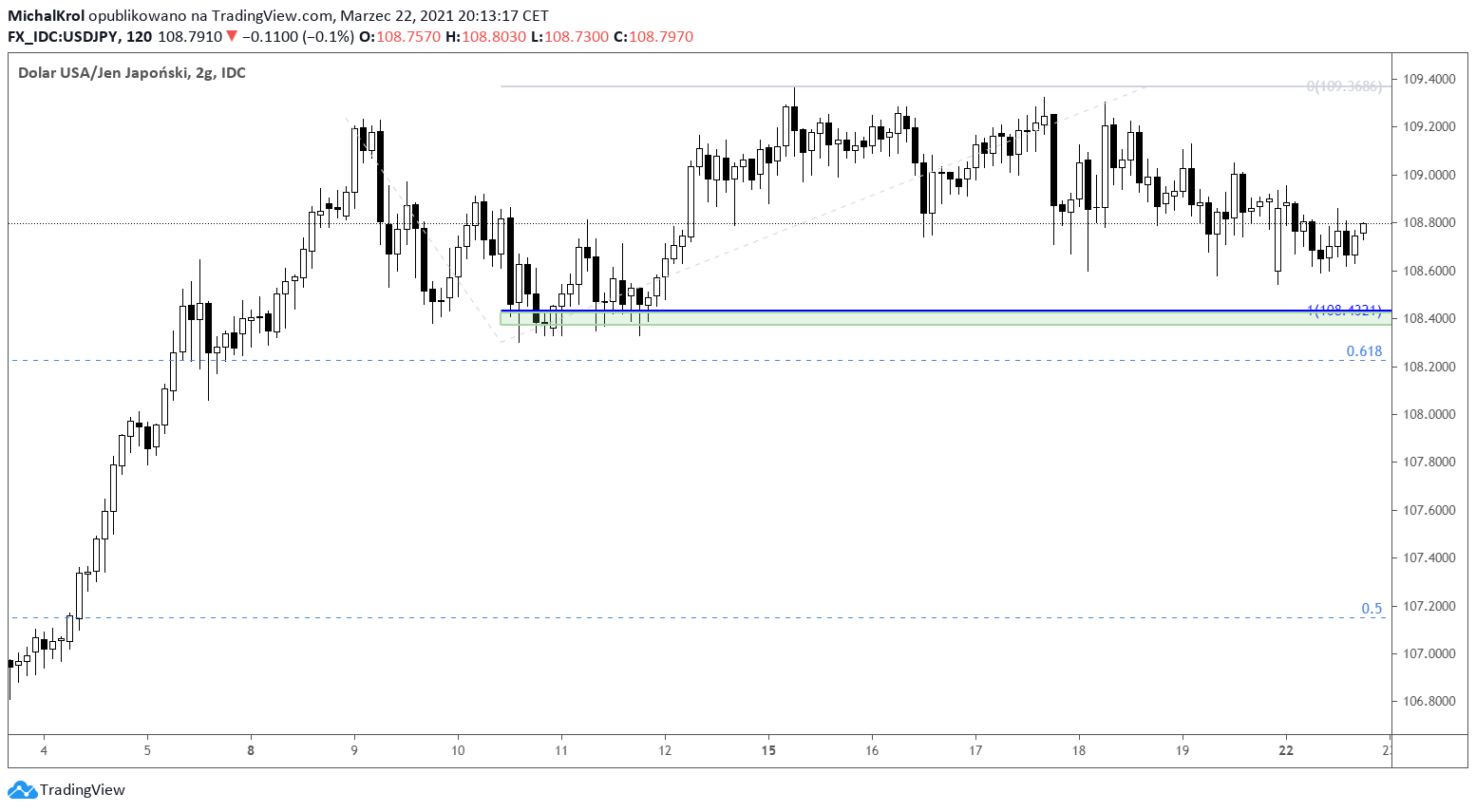 Obecny schemat techniczny opiera się na układzie korekcyjnym AB=CD. Mamy tu przykład korekty pędzącej, która przy zachowaniu równości wskazuje nam techniczną strefę popytową. Analizowany obszar wsparcia odnosi się do wyceny 108,40 – 108,45.