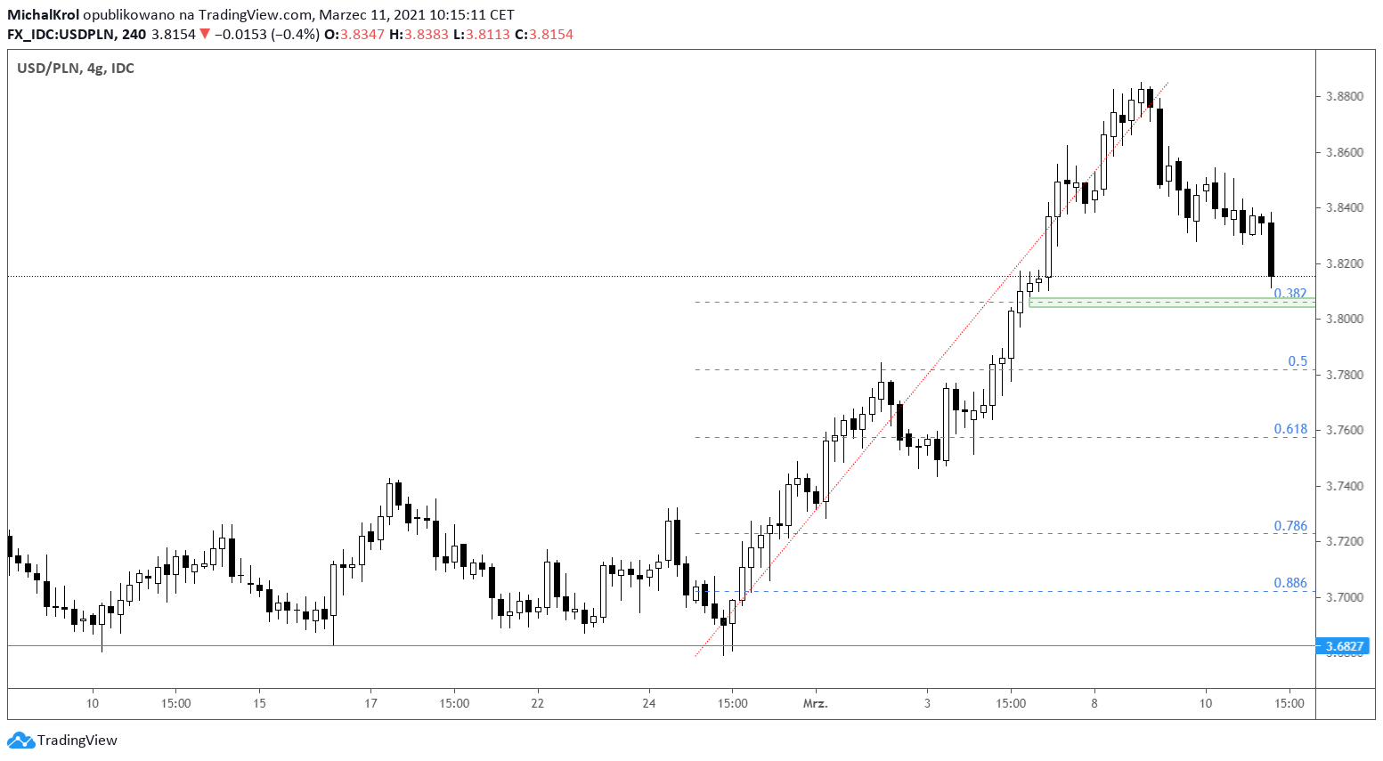 Na otwarciu bieżącego tygodniu notowania wyznaczają wierzchołek cenowy. Kurs odbija się od poziomu cenowego 3,8850. Po tym fakcie pojawia się dość dynamiczna korekta spadkowa, która przybliża wycenę USDPLN do pierwszego wsparcia. Bazujemy tutaj na wewnętrznym współczynniku Fibonacciego 38,2%. Odnosimy się więc do poziomu cenowego 3,8050.