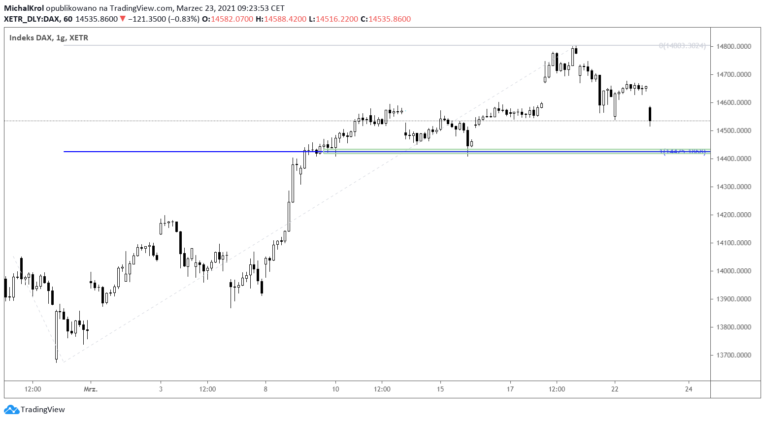 Ubiegły tydzień przyniósł wyznaczenie kolejnego historycznego maksimum na niemieckim indeksie. Po tym fakcie na wykresie pojawiła się narazie drobna realizacja zysków. Tutaj też wykorzystamy schemat overbalance, który umożliwia umiejscowienie najbliższe wsparcia. Odnosimy się do strefy cenowej 14 425 punktów, która została dynamicznie przetestowana w ubiegły poniedziałek.