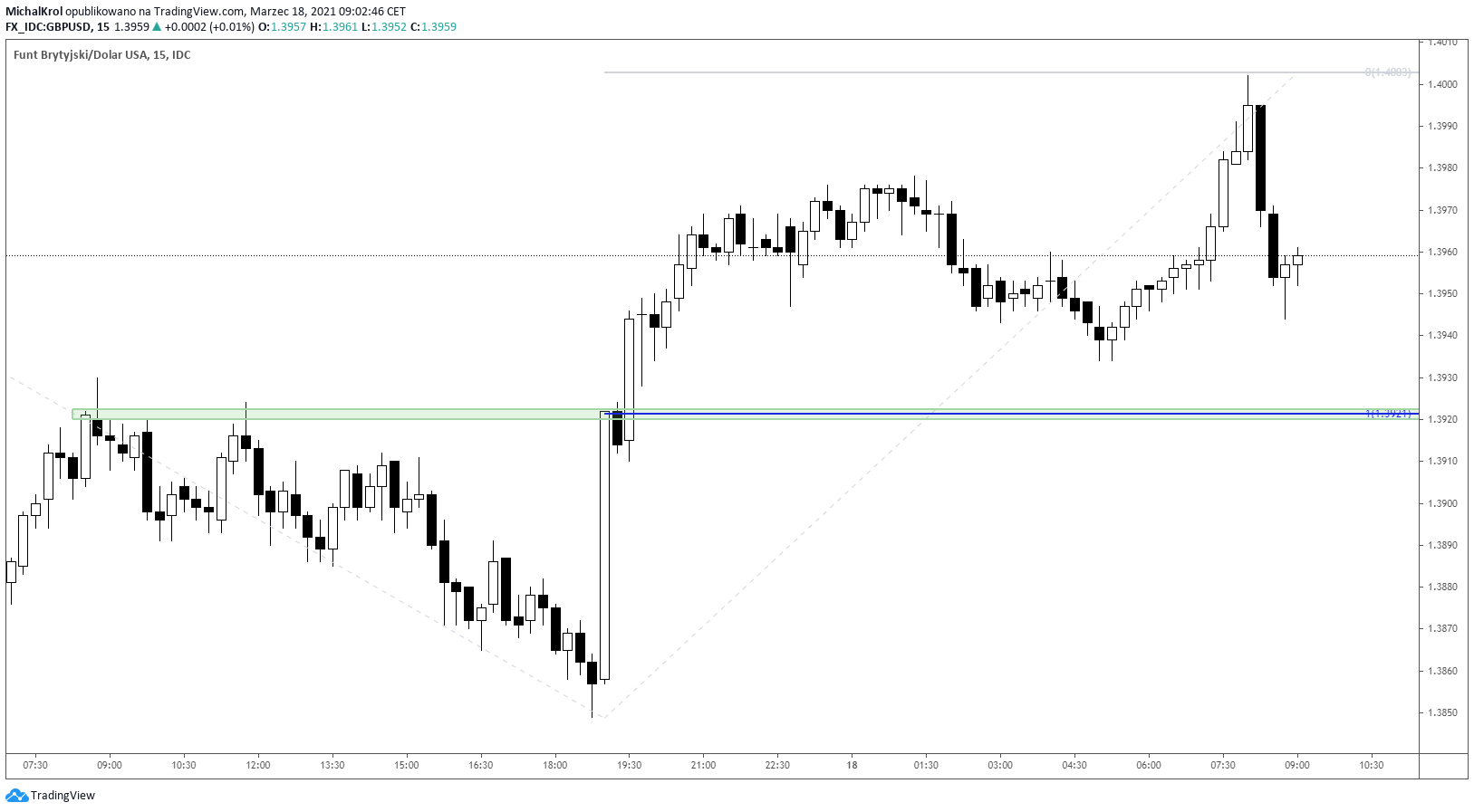Poniższy wykres przedstawia notowania pary walutowej GBPUSD na interwale 15-minutowym. Pozwala to zaprezentować dynamikę kursu na przestrzeni ostatnich kilkunastu godzin. W tym czasie notowania Kabla ukształtowały zakres wahań o rozpiętości mniej więcej 150 pipsów.