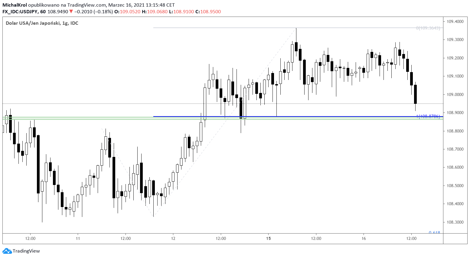Wtorkowa sesja europejska upływa pod znakiem słabości amerykańskiego dolara. Japońska waluta zyskuje na wartości, a wycena USDJPY zbliża się do strefy popytowej 108,88. Wyznaczony poziom wsparcia opiera się na silnej biegunowości, która potwierdzona jest przez mierzenie FE100.