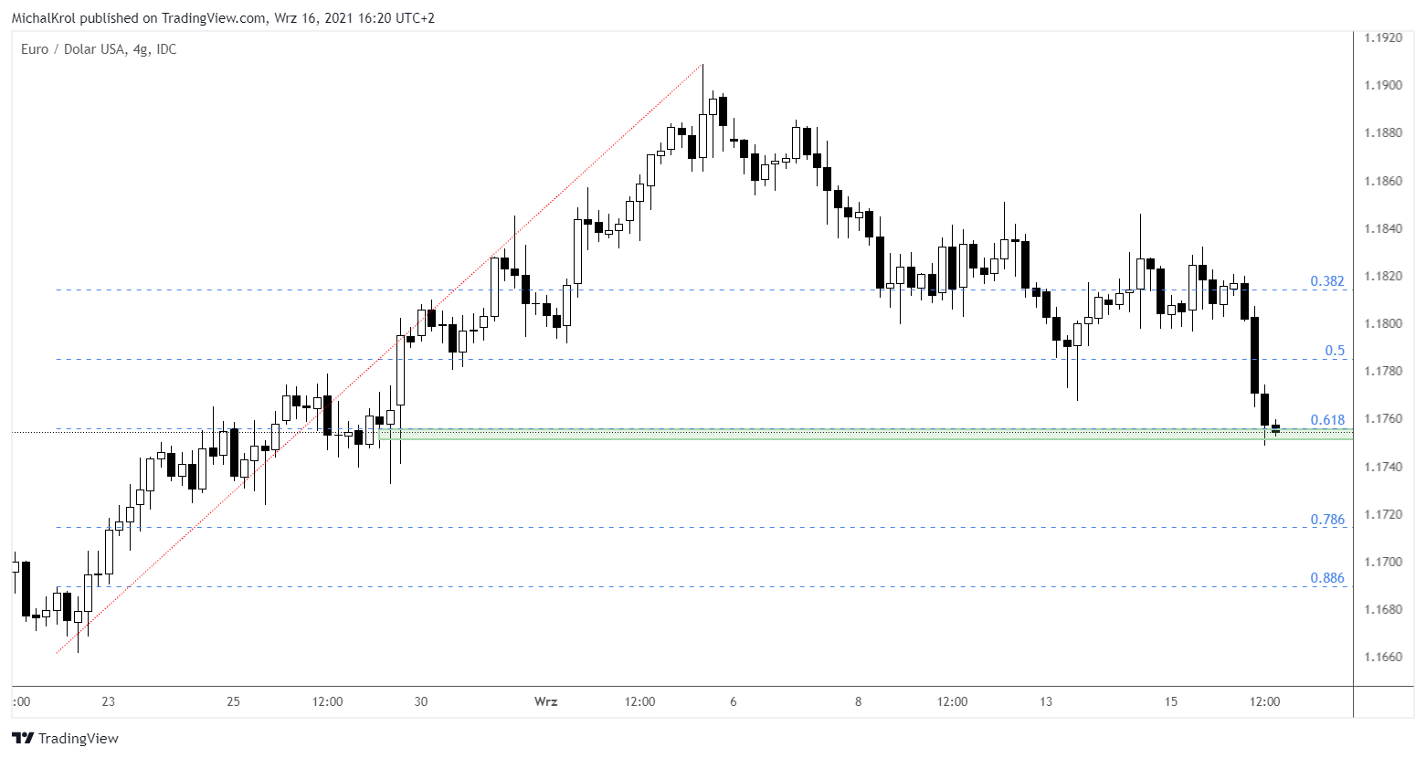 Spadki z bieżącego tygodnia osiągają coraz to niższe poziomy cenowe. W dniu dzisiejszym kurs Edka zaksięgował techniczną strefę wsparcia 1,1755. Jest to poziom oparty na kluczowym współczynniku Fibonacciego 61,8%. Obecnie obserwujemy sygnały techniczne oparte na formacjach świecowych.