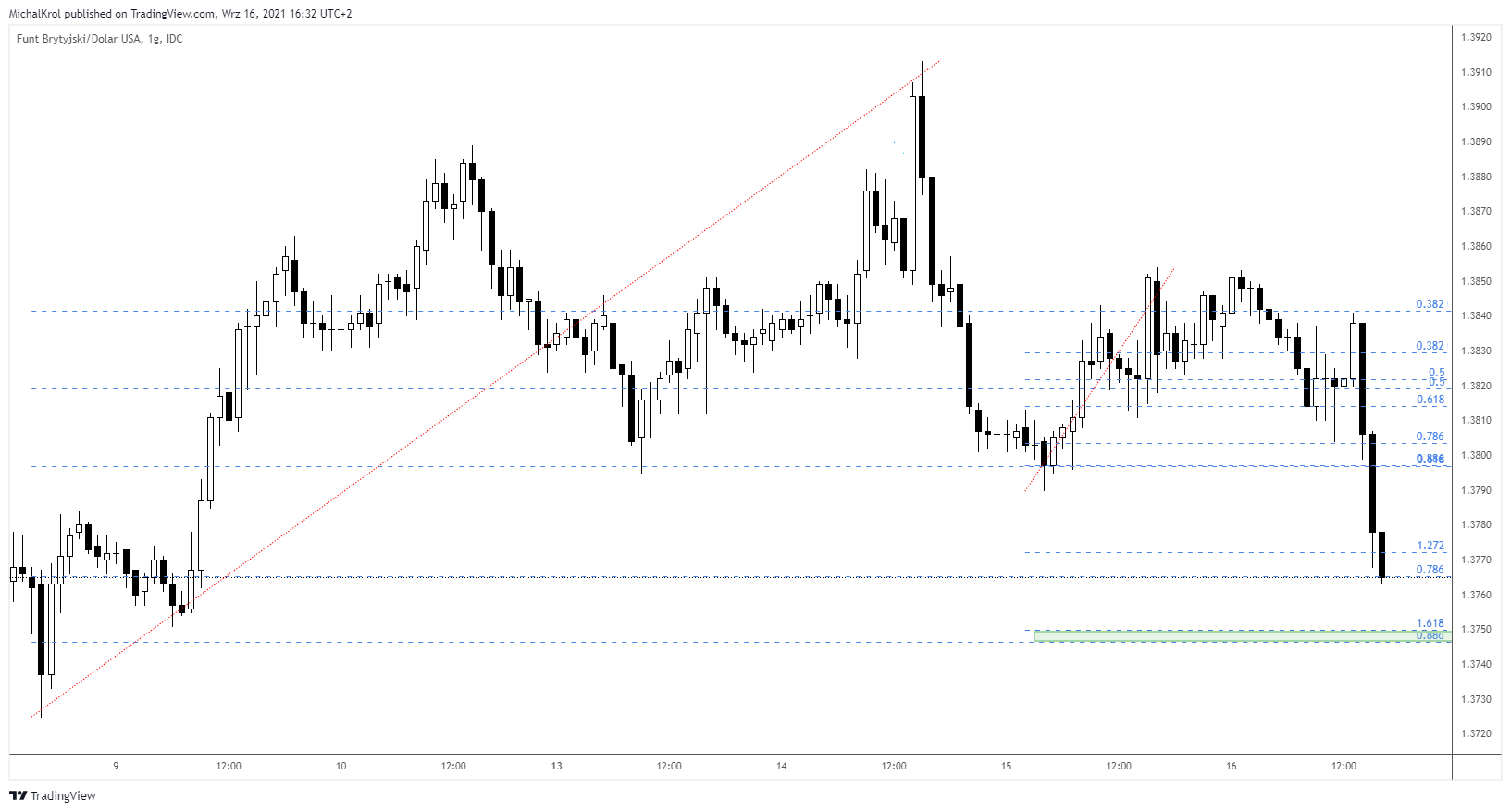 Obecnie widzimy, że notowania testują pułap współczynnika 78,6% fibo. Zakładamy jednak utrzymanie tendencji spadkowej i pogłębienie widocznego low. Bardziej precyzyjna wydaje się być kolejna strefa wsparcia ~ 1,3745 – 1,3750. Mamy tam bowiem cluster mierzeń 88,6% + 161,8%.