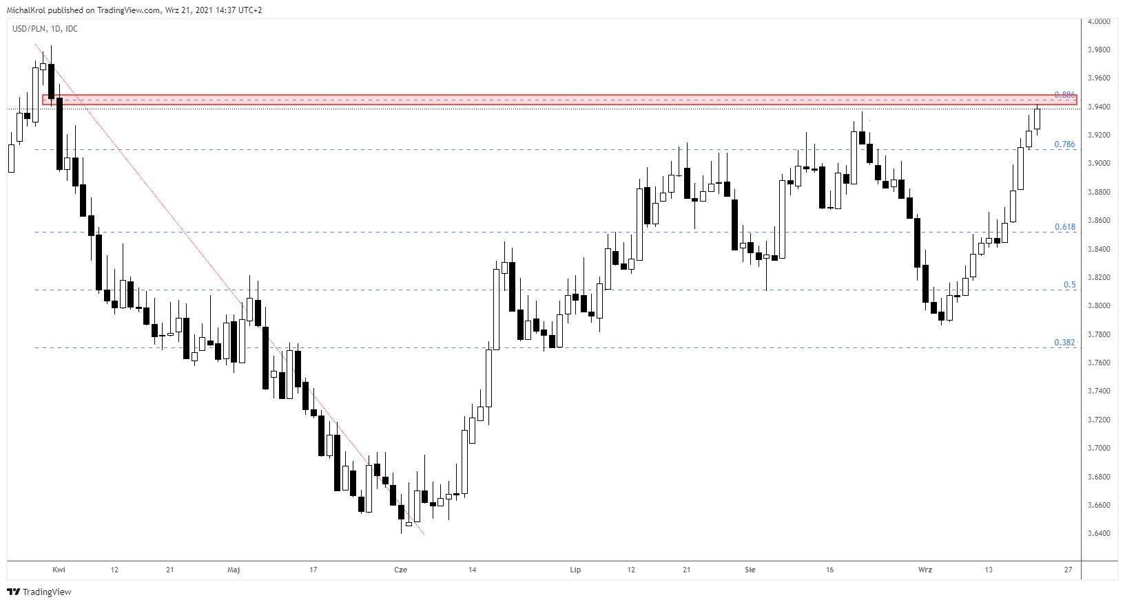 Drugi tydzień września rozpoczął się od dynamicznych wzrostów. Rynek odbił się od poziomu cenowego 3,7900. Po kilkunastu sesjach bez problemu przebite zostały rejony okrągłej bariery 3,9000. W tej chwili notowania zbliżają się do głębokiego mierzenia wewnętrznego 88,6%. Jest to zarazem ostatnia zapora podażowa dla notowań. W przypadku wybicia góra poziomu cenowego (3,9450), notowania powinny w bliskiej przyszłości zaatakować 4,0000.