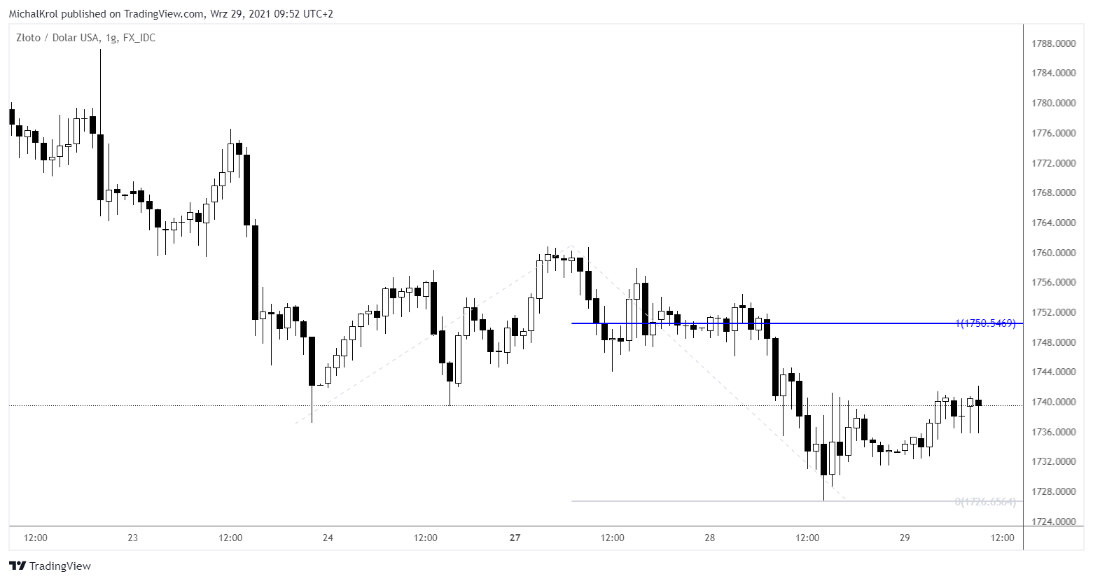 Lewa strona wykresu rozpoczyna się od wierzchołka cenowego po kursie 1 786 dolarów za uncję. W kolejnych godzinach obserwowaliśmy kształtowanie się trendu spadkowego. Notowania w dość szybkim tempie wykonały ruch na południe.