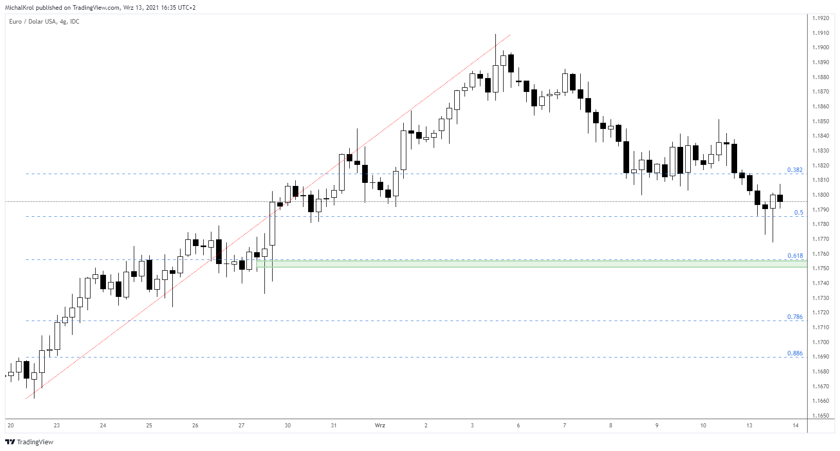 Lewa strona wykresu rozpoczyna się od dołka cenowego po kursie 1,1660. Przełom sierpnia i września był jednak okresem, w którym to dominującą rolę odgrywali kupujący. Tym samym wartość euro wzrastała w stosunku do dolara amerykańskiego.