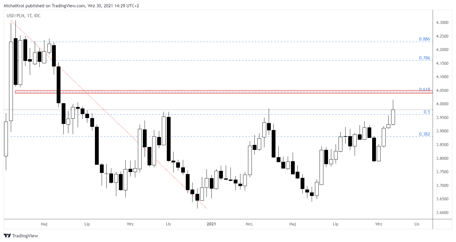 Wrzesień jest miesiącem dużej dominacji na rynku amerykańskiego dolara. Notowania wybijają roczne maksima i zbliżają się do technicznej strefy podażowej ~ 4,000 – 4,0100. Obiektywnym interwałem transakcyjnym dla tego scenariusza powinien być interwał sesyjny.