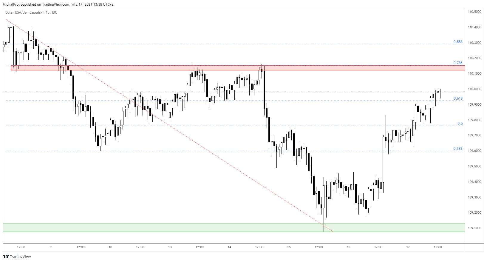 Sesja czwartkowa i piątkowa to okres budowania siły amerykańskiego dolara. Rynek osiągnął dziś lokalne high po okrągłym kursie 110,00. Potencjalny target wzrostowy znajduje się jednak jeszcze wyżej i odnosi się do strefy cenowej 110,15. Mamy tam bowiem głębokie mierzenie wewnętrzne 78,6% fibo oraz wyraźną biegunowość.