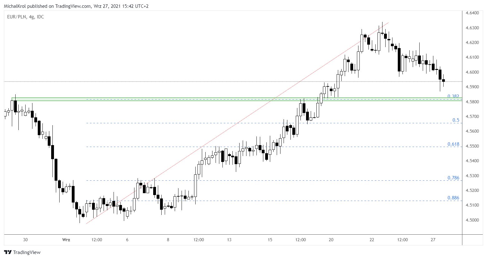 Spadki jakie obserwujemy na EURPLN zbliżają się do strefy wsparcia ~ 4,5820. Na tym poziomie mamy wyznaczony poziom popytowy, który opiera się na współczynniku Fibonacciego 38,2%. Silnym wzmocnieniem tej strefy jest wyraźna biegunowość obszaru.