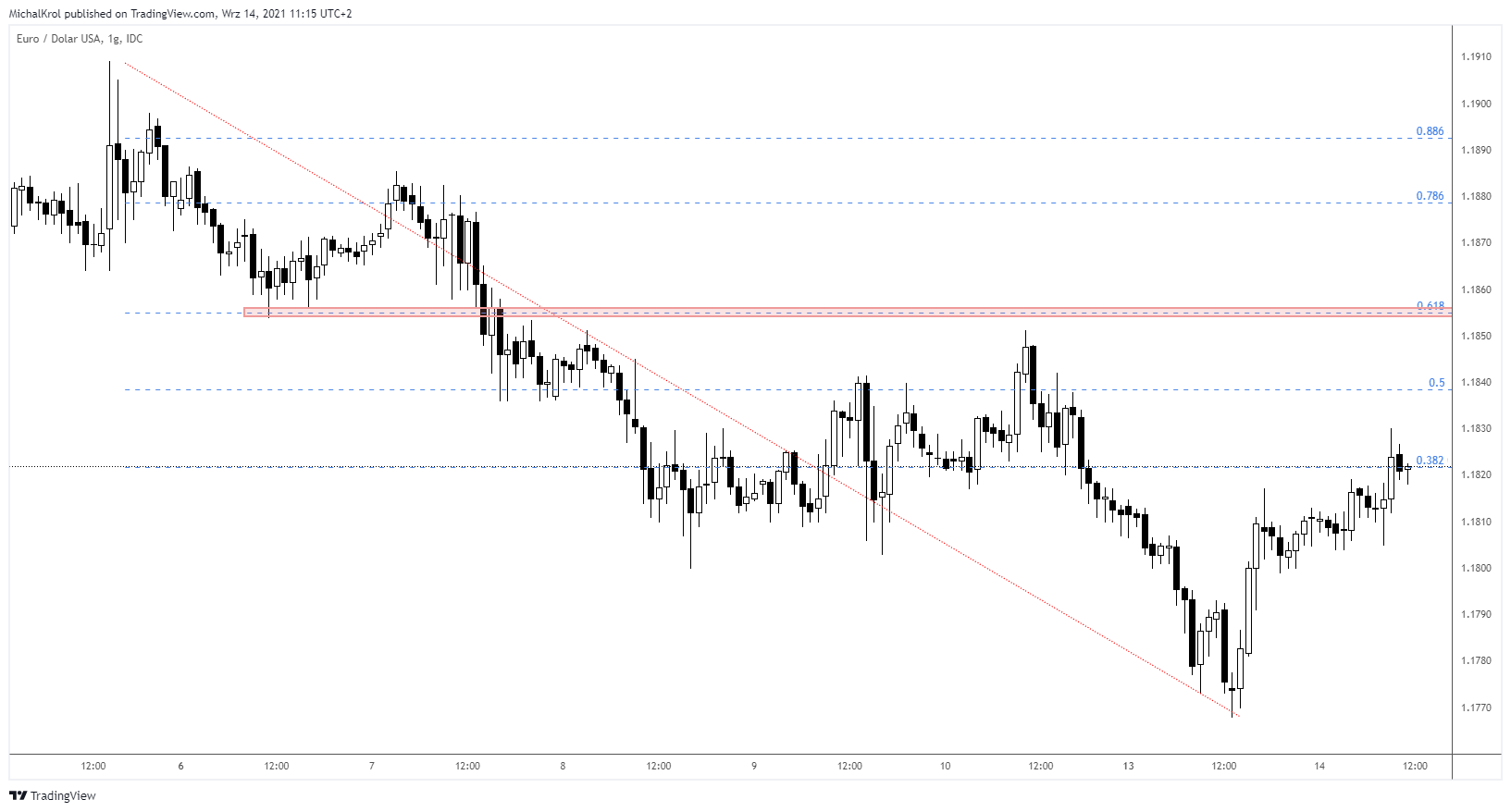 Poniższy wykres przedstawia notowania pary walutowej EURUSD na interwale 1-godzinowym. Pozwala to zaprezentować dynamikę kursu na przestrzeni ostatnich kilku sesji giełdowych. W tym czasie notowania ukształtowały zakres wahań o rozpiętości mniej więcej 140 pipsów.