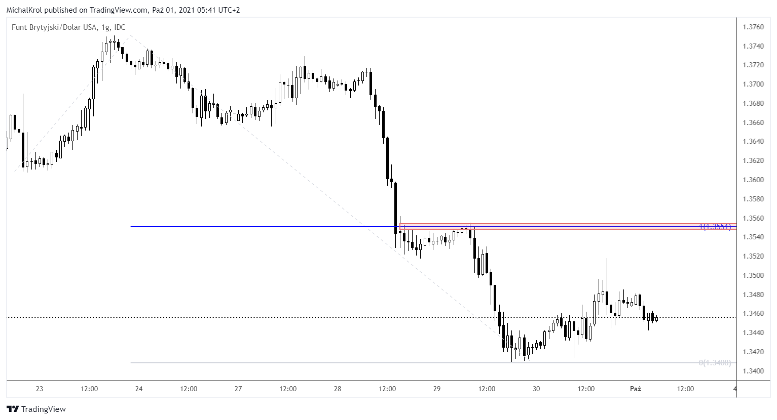 Poniższy wykres przedstawia notowania pary walutowej GBPUSD na interwale 1-godzinowym. Pozwala to zaprezentować dynamikę kursu na przestrzeni ostatnich kilku sesji giełdowych. W tym czasie notowania ukształtowały zakres wahań o rozpiętości mniej więcej 350 pipsów.