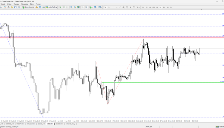 Lewa strona wykresu rozpoczyna się od wyraźnego swingu spadkowego. Cały ten ruch wykonany został w przeciągu ostatnich kilku sesji maja. Ukształtowany dołek odnosi się do okrągłej wyceny 38 000 punktów.