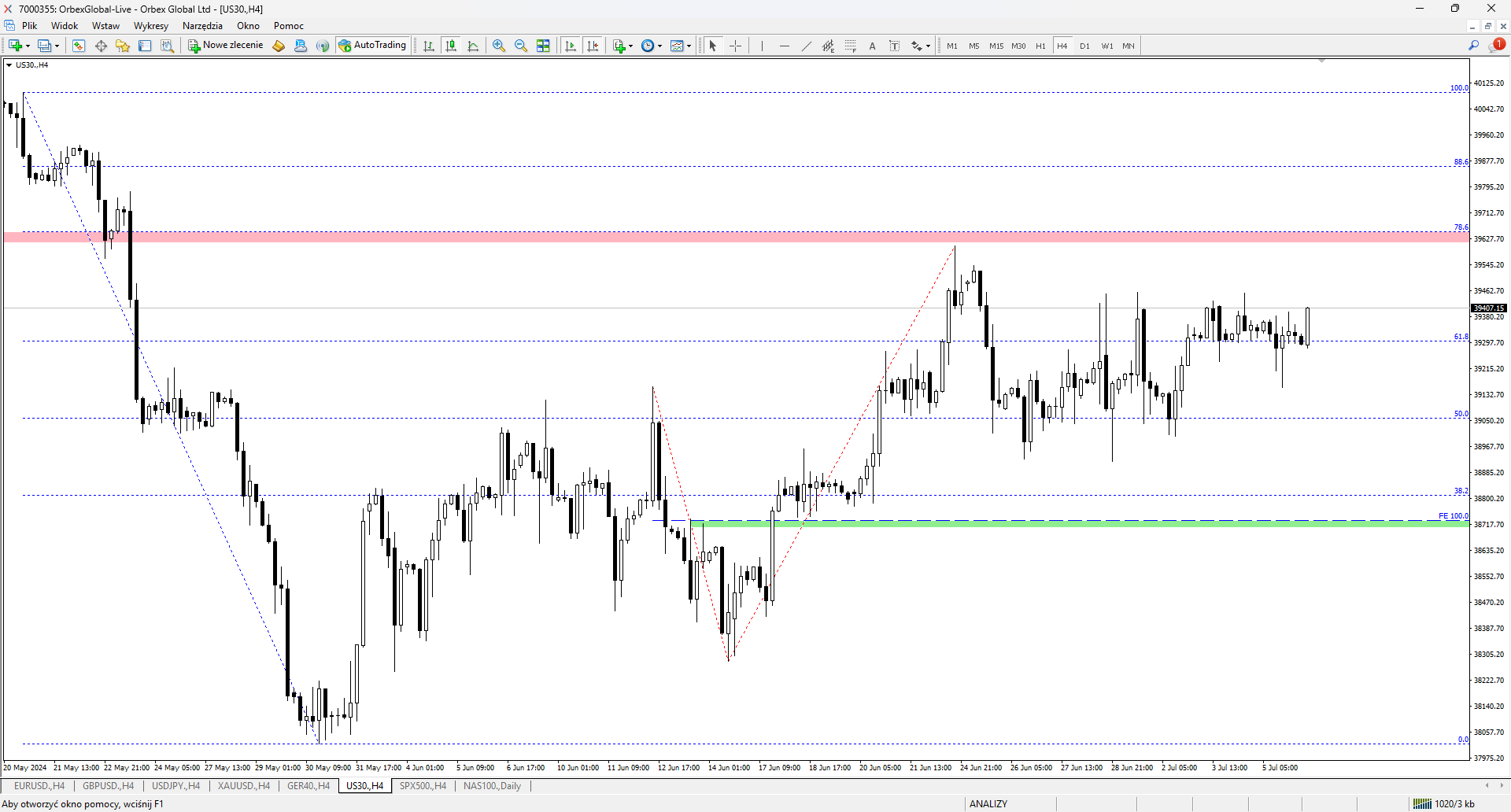 Ostatnie dwa tygodnie to okres dość monotonny. Mam tutaj na myśli zmienność na wykresie indeksu Dow Jones. Kurs porusza się pomiędzy dwoma technicznymi strefami. Bliżej nam obecnie do poziomu podażowego, który bazuje na mierzeniu Fibonacciego 78,6% po kursie 39 650 punktów. Od dołku wyznaczone mamy wsparcie na mierzeniu FE100. W tym przypadku interesuje nas wycena w okolicy 38 730 punktów.