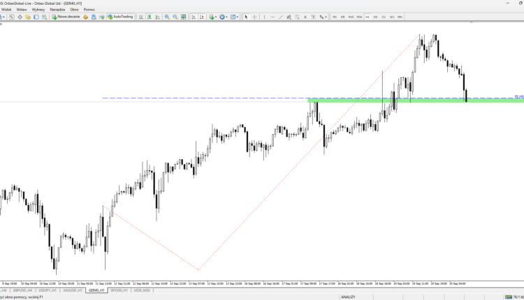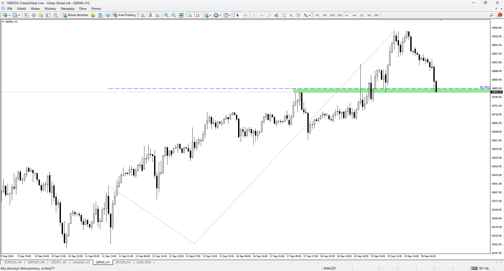 Obecny scenariusz skupia się na bardziej lokalnym schemacie. Obserwujemy trend wzrostowy, na którym pojawia się układ FE100. Zielonym kolorem oznaczona została aktualna strefa popytowa, która jest już testowana przez rynek. Warto zaobserwować reakcje kupujących na tym obszarze. Ewentualna obrona strefy i sygnał kupna będzie wspierany przez panujący trend.