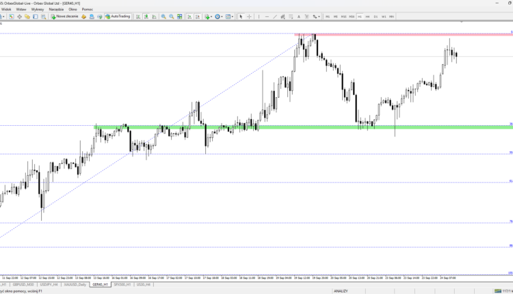 Poniższy wykres przedstawia notowania niemieckiego indeksu giełdowego DAX na interwale 1-godzinowym. Pozwala to zaprezentować dynamikę kursu na przestrzeni ostatnich kilkunastu sesji giełdowych. W tym czasie notowania ukształtowały zakres wahań o rozpiętości mniej więcej 800 punktów.