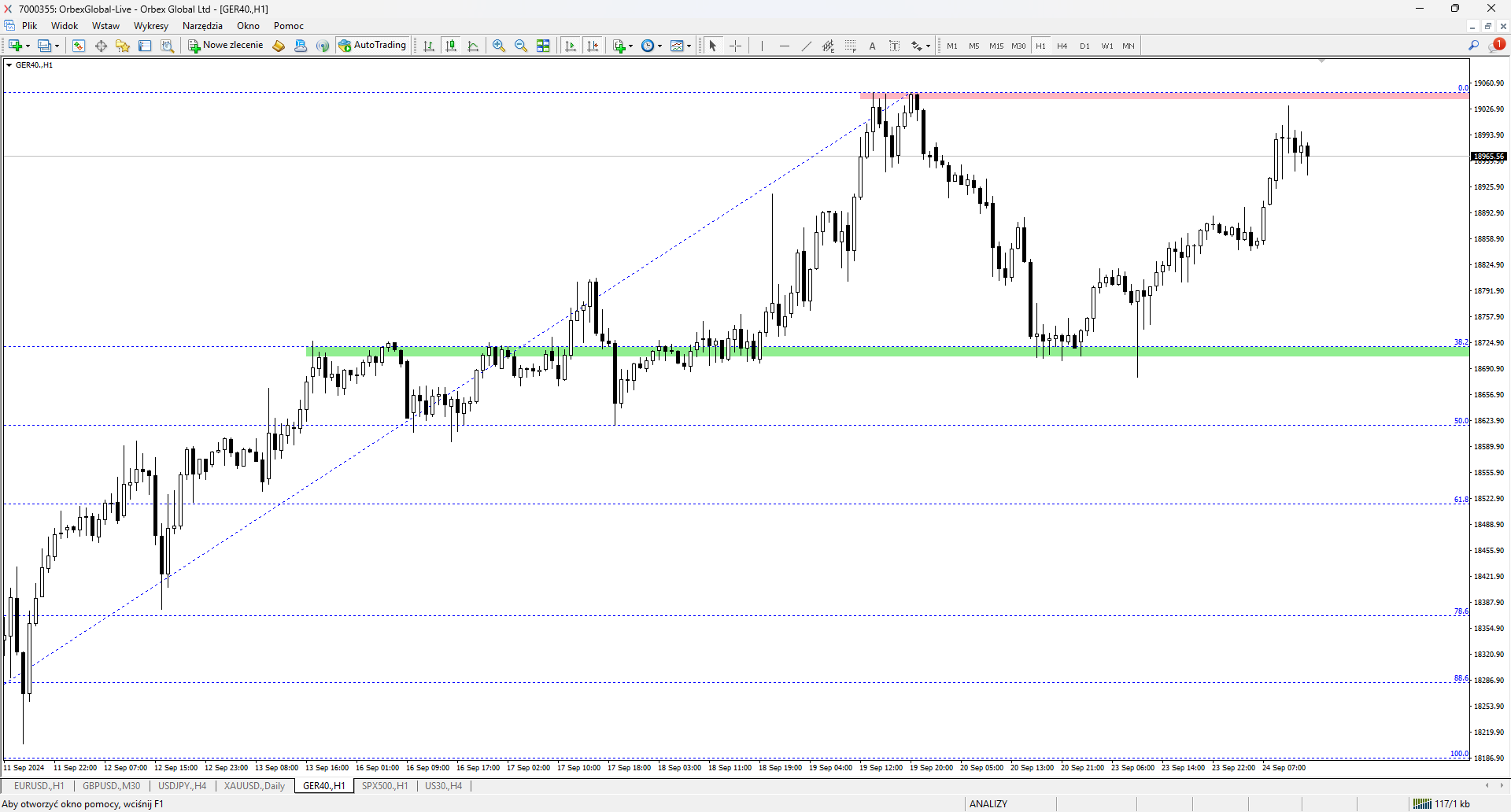 Obecne maksimum przekroczyło okrągłą barierę 19000 punktów. Rynek wygenerował też pokaźną korektę spadkową, która potwierdziła obecny poziom podażowy. Wspomniany pułap odnosi się do wyceny 18720 punktów. Bieżący tydzień to powrót w okolice aktualne oporu. Aktualna pozostaje bowiem strefa podażowa po kursie 19050 punktów.
