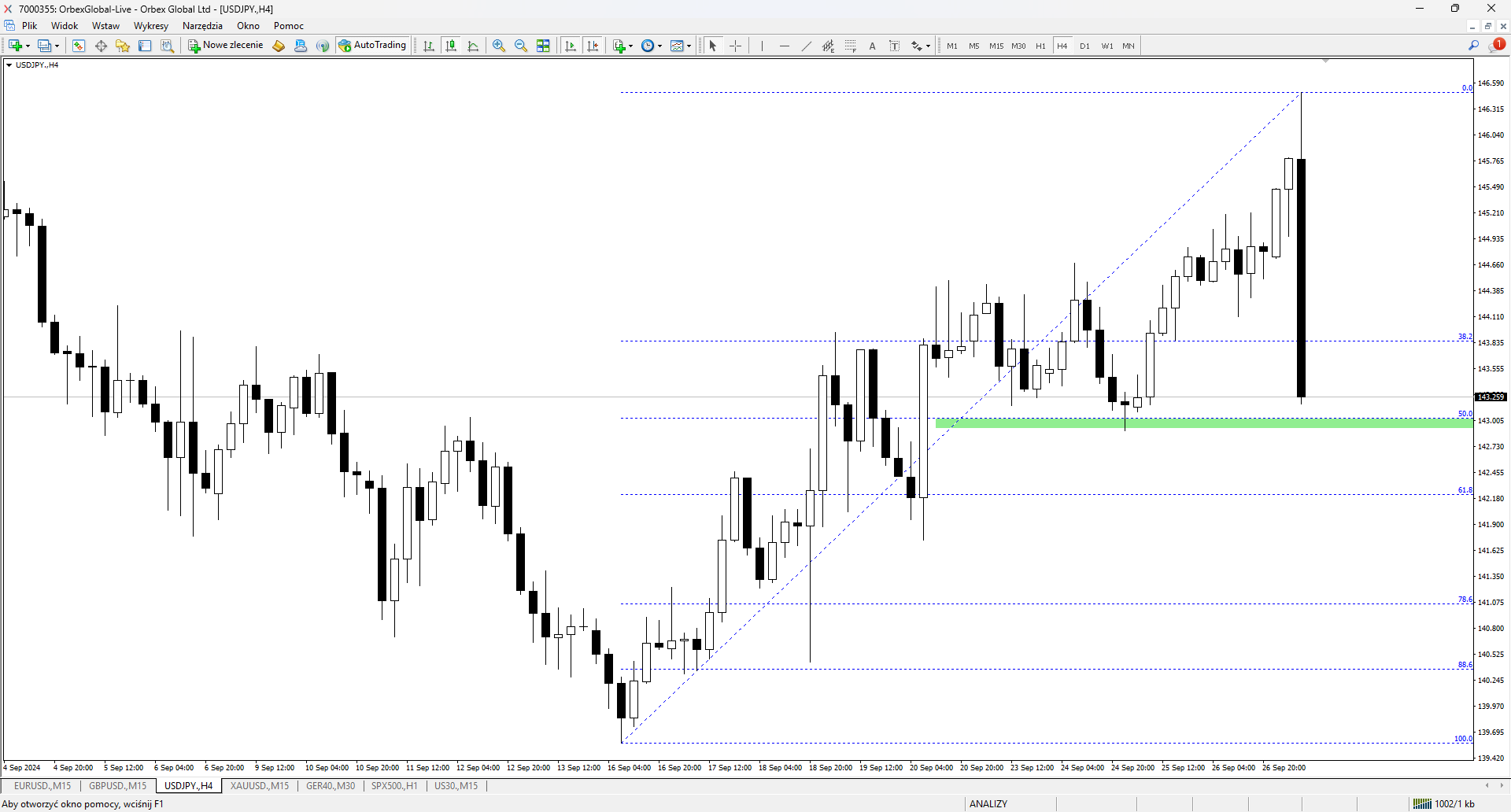 Na bazie obecnego odbicia rozkładamy siatkę mierzeń. Po dynamicznym tąpnięciu w dniu dzisiejszym, jesteśmy już bardzo blisko strefy popytowej na wysokości mierzenia 50%. Odnosimy się tutaj do wyceny rynkowej po okrągłym kursie 143,00.