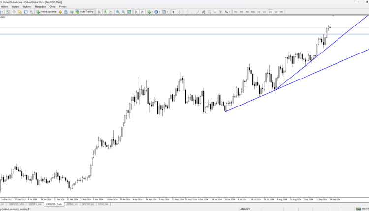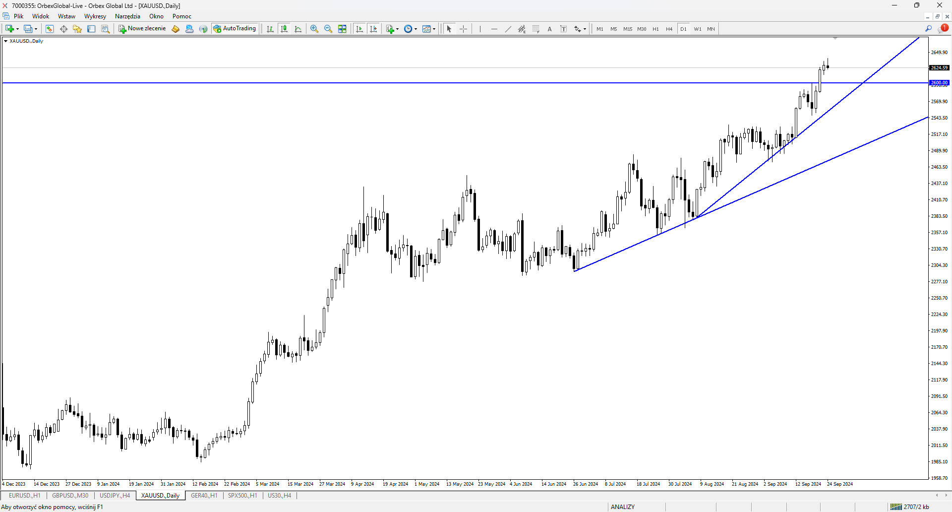 Lewa strona wykresu rozpoczyna się od dołków z przełomu 2023 i 2024 roku. Wtedy to wycena złota oscylowała w okolicy okrągłej bariery 2000 dolarów za uncję.