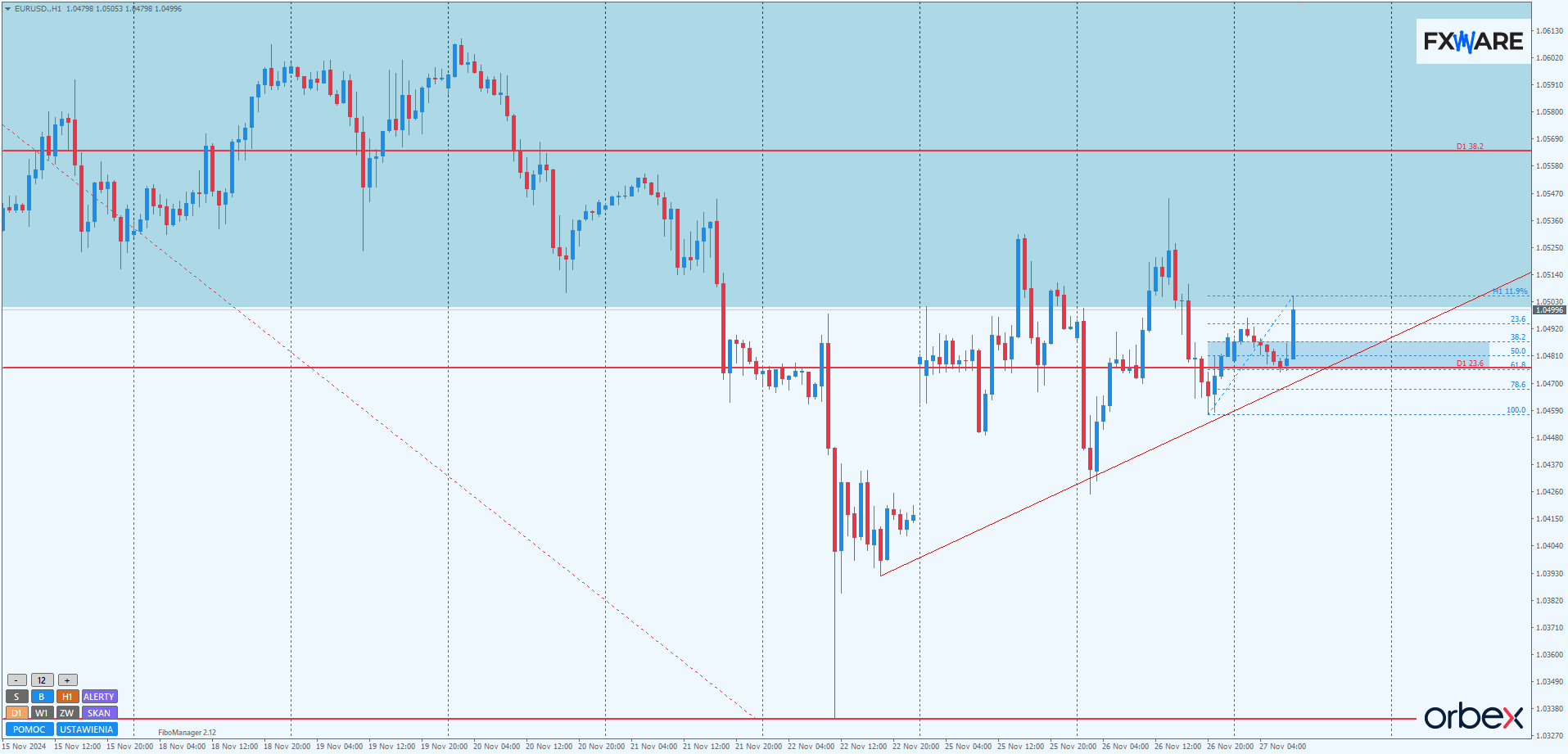 Na chwilę obecną zmierzamy w stronę poziomu 1,05200, który od blisko dwóch tygodni stanowił najpierw wsparcie (rysując konsolidację od 14 do 21 listopada), a obecnie, zgodnie z zasadą zmiany biegunów, opór. Pokonanie tego poziomu otworzy popularnemu „Edkowi” drogę do pogłębiania korekty swingu spadkowego widocznego na D1. Alternatywnie, przebicie LT na dużym momentum bardziej uprawdopodobni spadki, nawet do poziomu 1,04000.