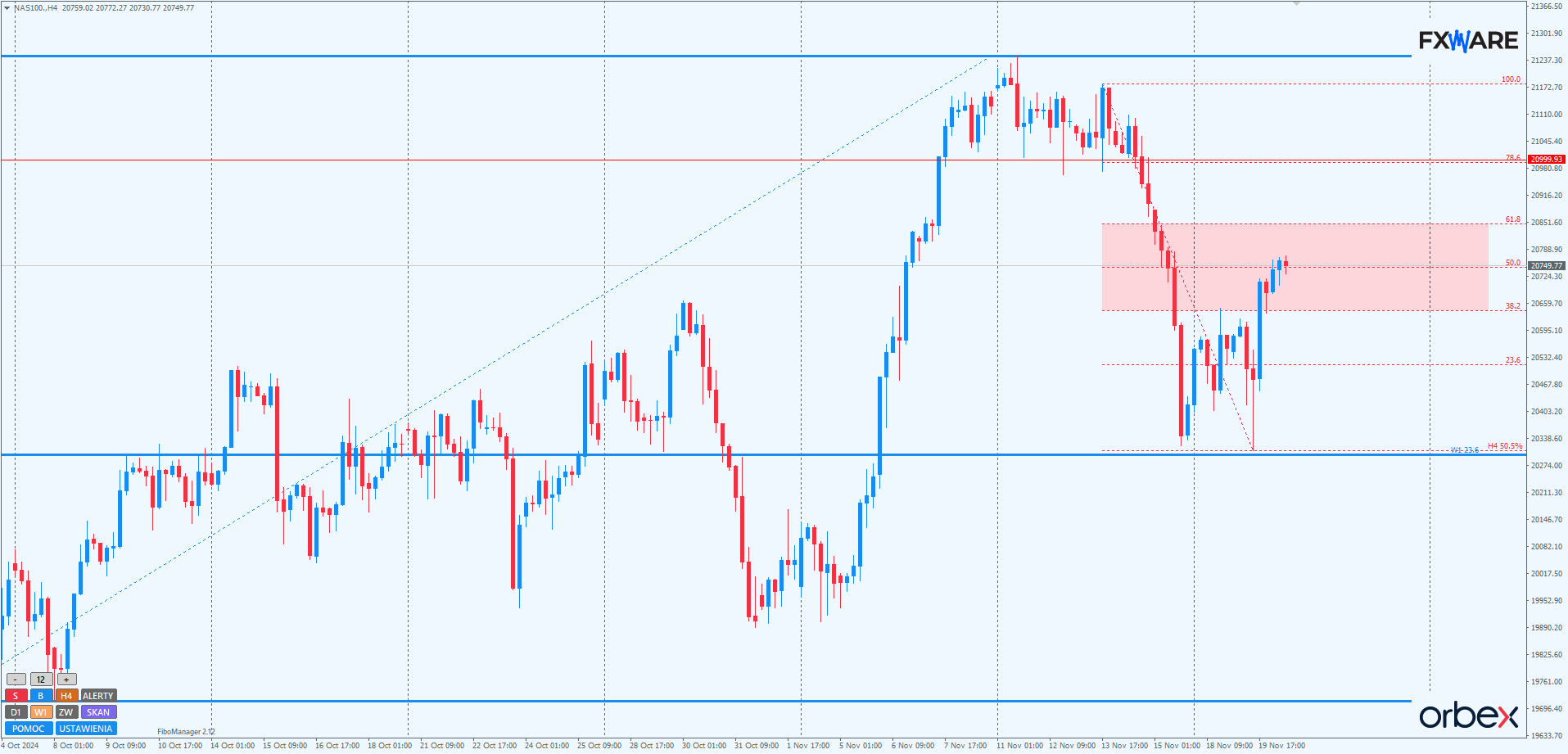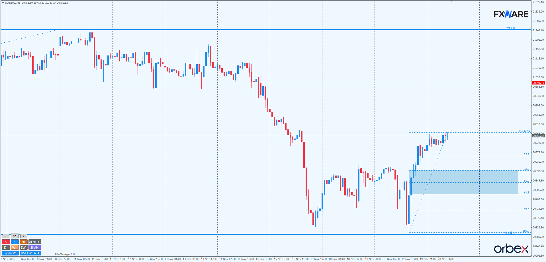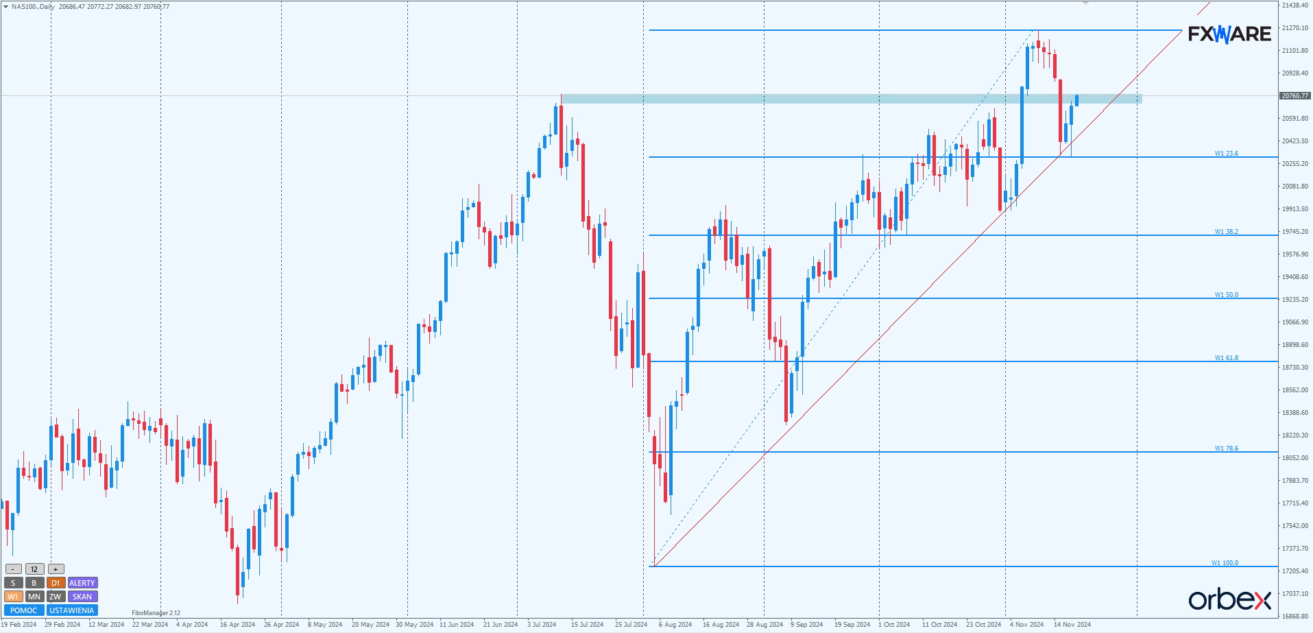 Jeżeli prędkość wzrostów zostanie utrzymana, można spodziewać się osiągnięcia poziomów ATH w ciągu 2-3 dni. Spowolnienie momentum wzrostowego, szczególnie dzisiaj po otwarciu rynku kasowego, oraz mocniejsze odbicie poniżej 21000 mogłoby natomiast zwiększyć prawdopodobieństwo scenariusza dalszych spadków. Aby jednak mówić o takim scenariuszu, zamknięcie świecy D1 musiałoby nastąpić poniżej wzrostowej LT, a nawet wspomnianego na początku poziomu Fibo 23,6%.