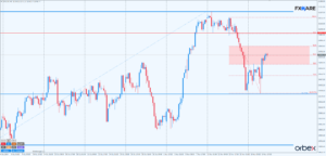 NAS100, pomimo sześciu sesji przyspieszających spadków od ATH (11 listopada) i dość gładkiego przebicia od góry strefy SD, zdołał złapać oddech na poziomie Fibo 23,6% średnioterminowego trendu wzrostowego, który przebiega na poziomie 2300. W tym miejscu znajdowała się również linia trendu. Podwójne odbicie trwa już trzeci dzień i właśnie dociera, na znacznie mniejszym rozpędzie niż ostatni swing w dół, w okolice 20750.