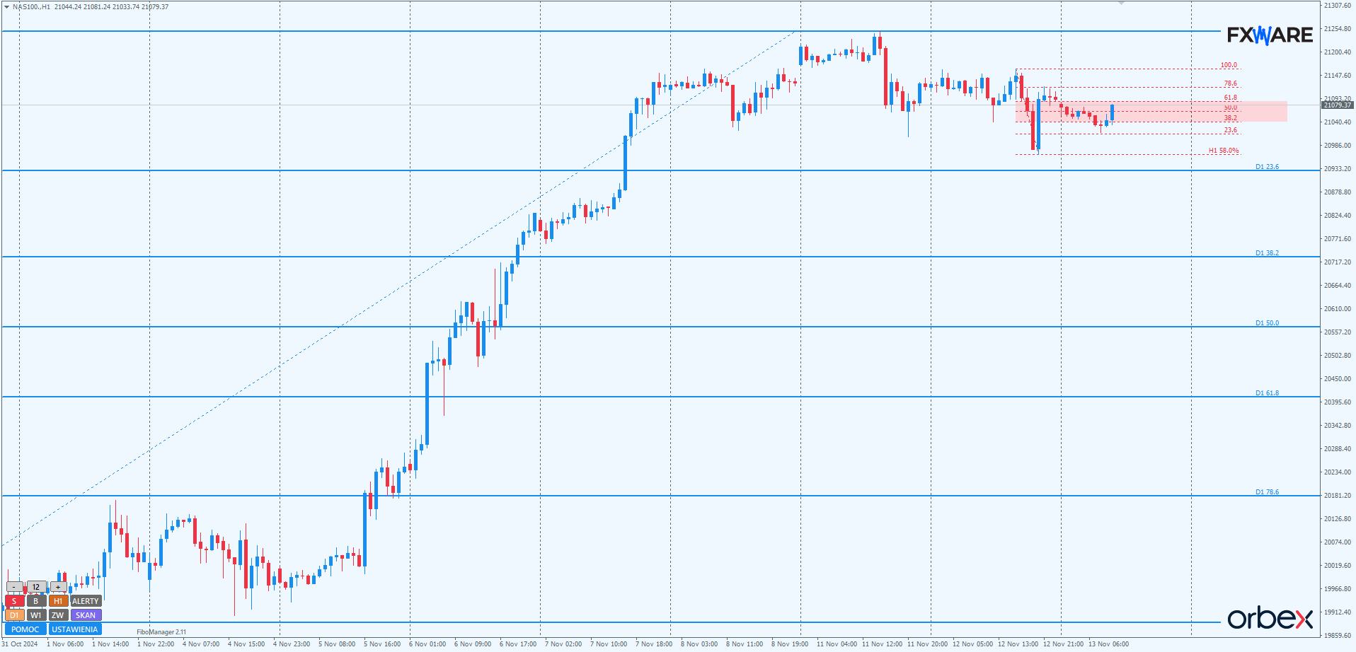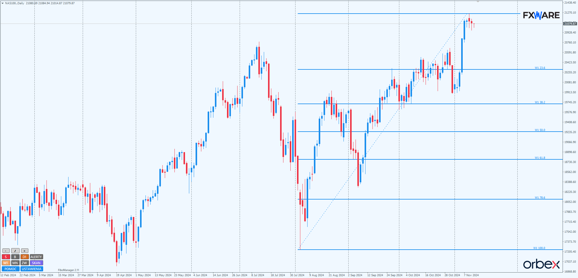Od początku listopada NAS100 pokazuje, że nie powiedział jeszcze ostatniego słowa w kwestii wzrostów. Choć końcówka października przebiegła pod znakiem nieudanych testów poziomów lipcowego ATH, a ostatni z nich zakończył się nawet odrzuceniem ceny ze sporym momentum od poziomów w okolicach 20 500, to powyborczy rajd wywindował kurs indeksu na nowe rekordy.