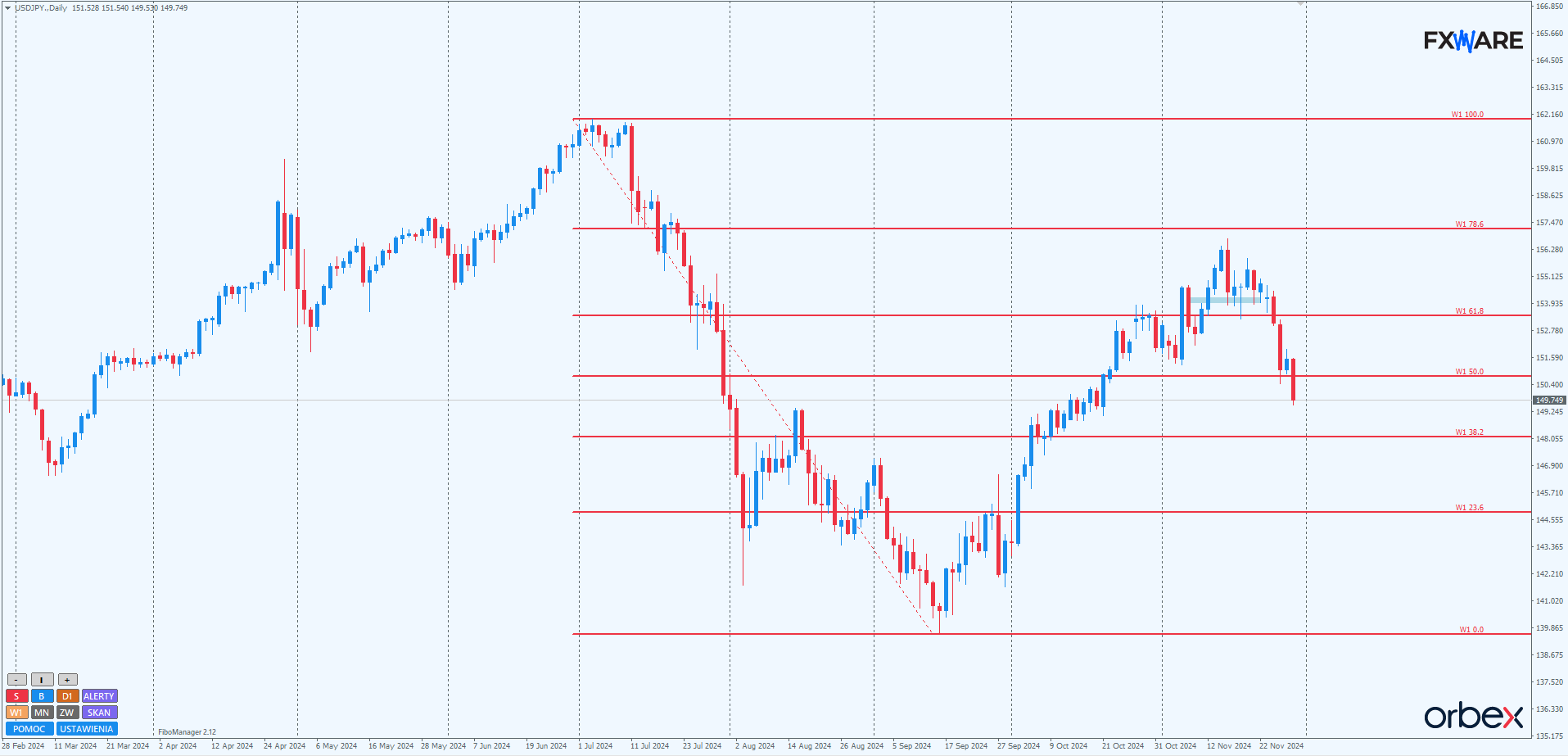 Jen 3 dni temu ostatecznie pokonał wsparcie na poziomie 154.000. O tym, jak ważne było to zwycięstwo dla niedźwiedzi, świadczy rozmach swingu, który nastąpił później. W ciągu 3 dni dotarliśmy do zniesienia 38,2% trendu wzrostowego, trwającego od 16.09.2024.