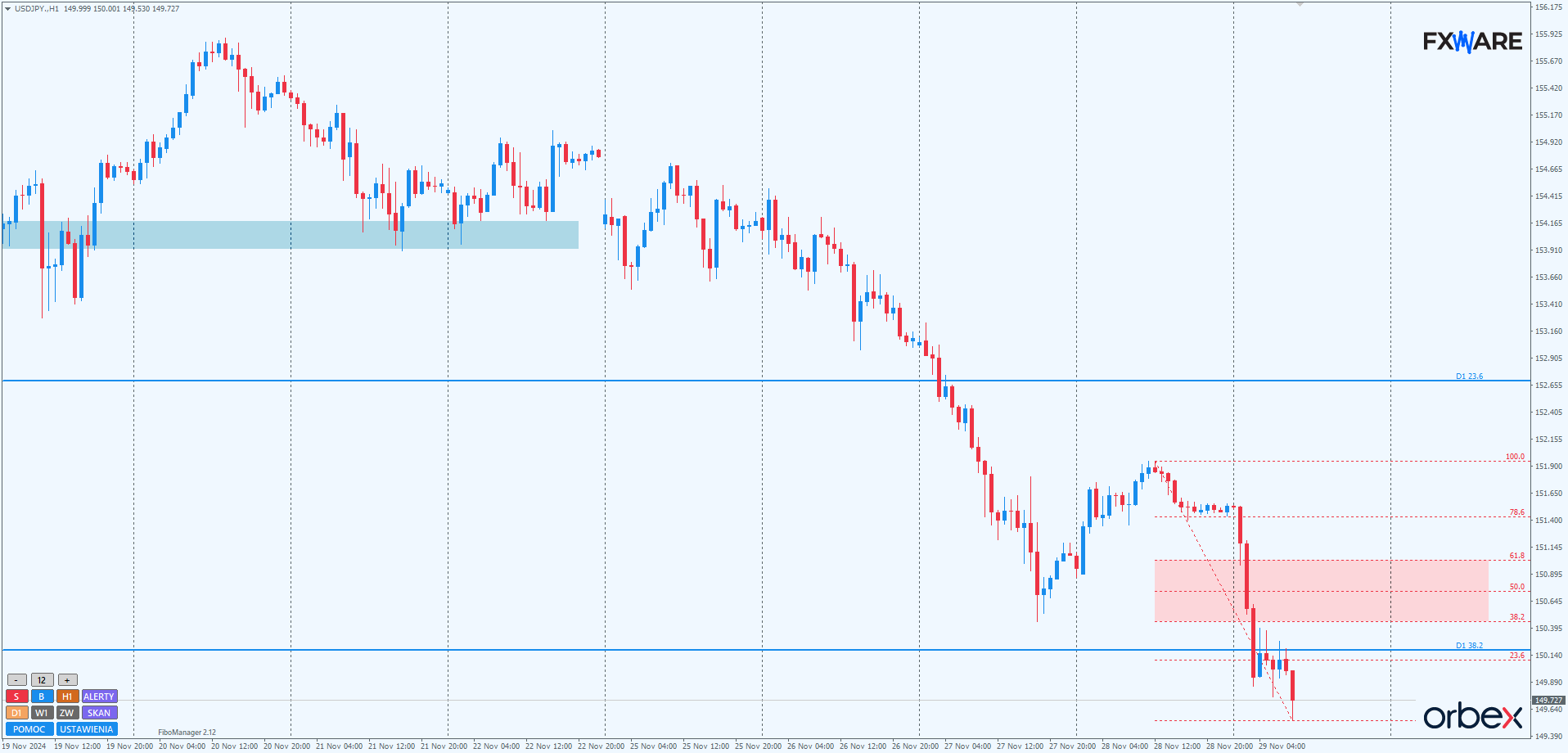 Na wykresie H1 warto zwrócić uwagę na zniesienia Fibo w strefie 38,2–61,8% swingu spadkowego liczonego od wczorajszych szczytów. Niewykluczone jest ich odwiedzenie przez cenę, nawet w przypadku dalszych spadków. Zniesienia te przebiegają mniej więcej na poziomie 150.500–150.900. Dotarcie do nich przy niewielkim momentum upewni niedźwiedzie, że to dobre miejsce na ponowną sprzedaż. Alternatywnie szybki powrót powyżej 151.000 jeszcze w trakcie dzisiejszej sesji chwilowo zaneguje scenariusz dalszych, szybkich spadków.