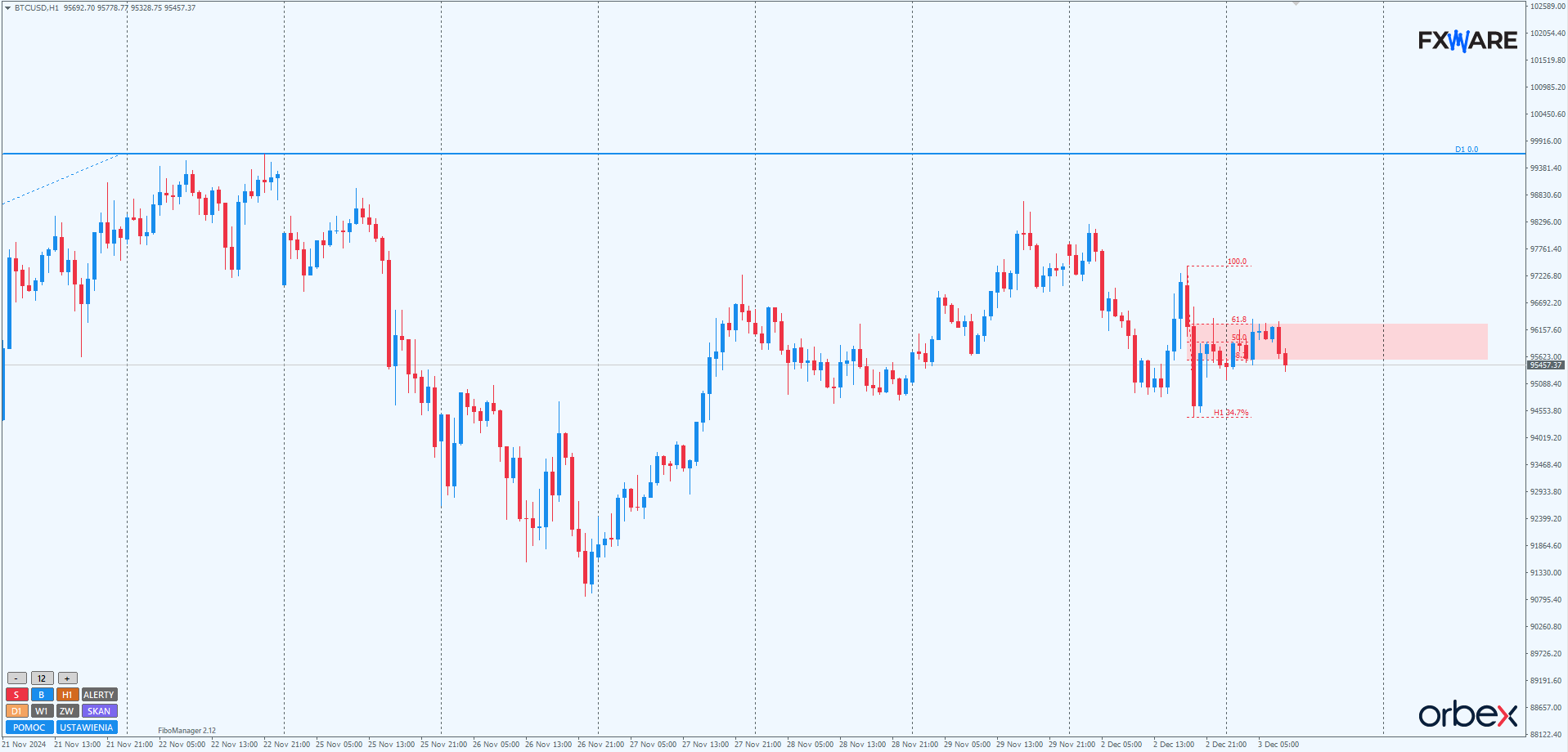 Na H1 od kilku dni trwa konsolidacja pomiędzy 98 150 a 94 600. Jednak z powodu momentum pojawiającego się w jej górnych rejonach, szanse na wyjście dołem są odrobinę większe. Aktualnie cena walczy w strefie 38,2–61,8% ostatniego wczorajszego swingu spadkowego. Pokonanie 94 700, czyli wczorajszego minimum, jest niezbędne, żeby w ogóle rozważać spadki do 90 000. Scenariuszem negującym będzie powrót na dużym rozpędzie w okolice 98 300, gdzie znajduje się piątkowe maksimum, oraz przebicie i retest tego poziomu. Wtedy droga ceny ponad 100 000 będzie bardziej prawdopodobna.