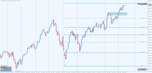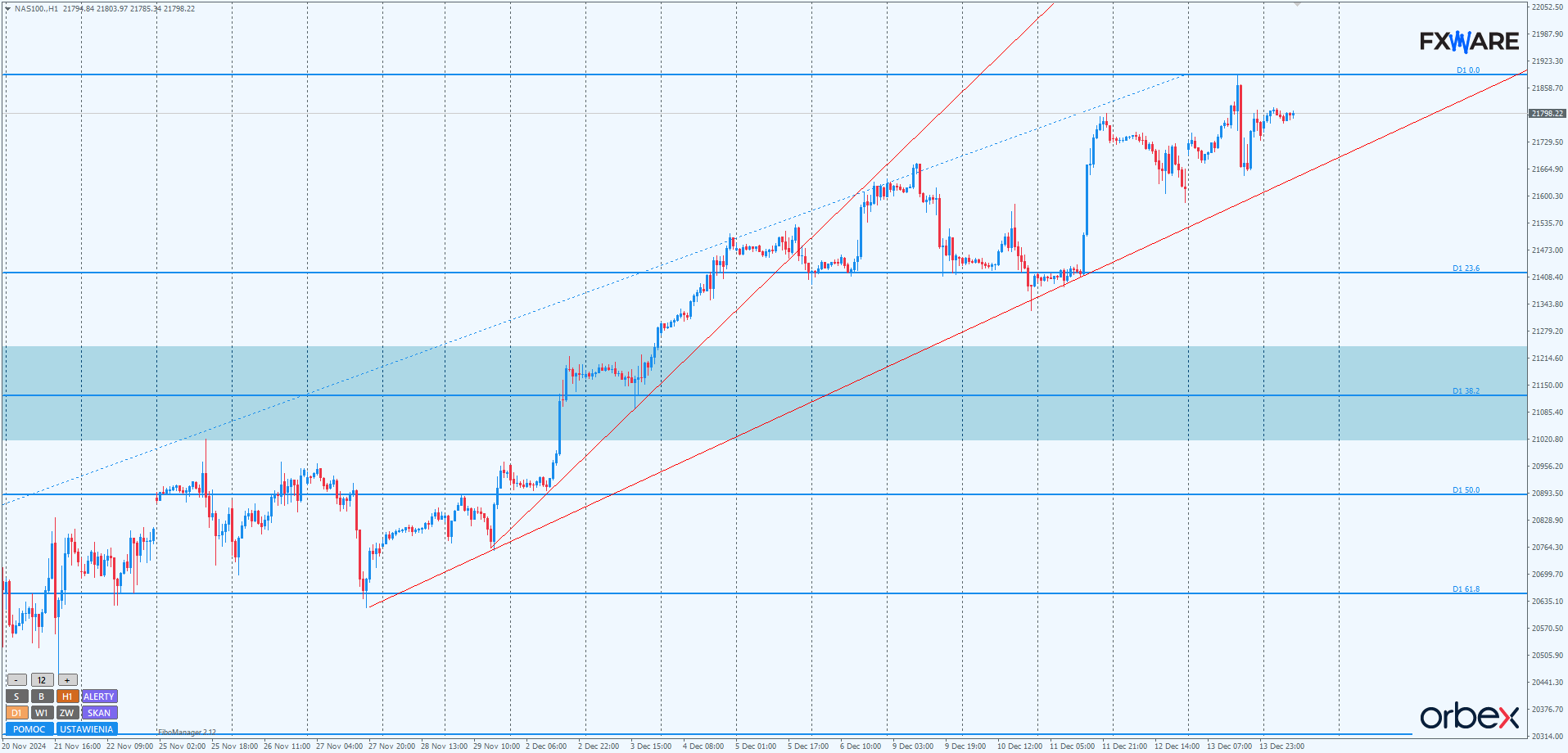 Na wykresie dziennym NASDAQ kontynuuje wzrosty, które wraz z początkiem grudnia wyraźnie przyspieszyły. Codziennie albo co drugi dzień ustanawiany był nowy ATH. Piątkowy rekordowy szczyt jest w formie pinbara, co być może pozwoli podaży wyprowadzić jakąkolwiek kontrę. Ponowne odwiedzenie listopadowych szczytów, a także niższego poziomu 20700, gdzie znajdował się szczyt lipcowy oraz strefa konsolidacji z końca listopada, jest jak najbardziej możliwe i nie zaburzy obrazu kilkumiesięcznego trendu wzrostowego.