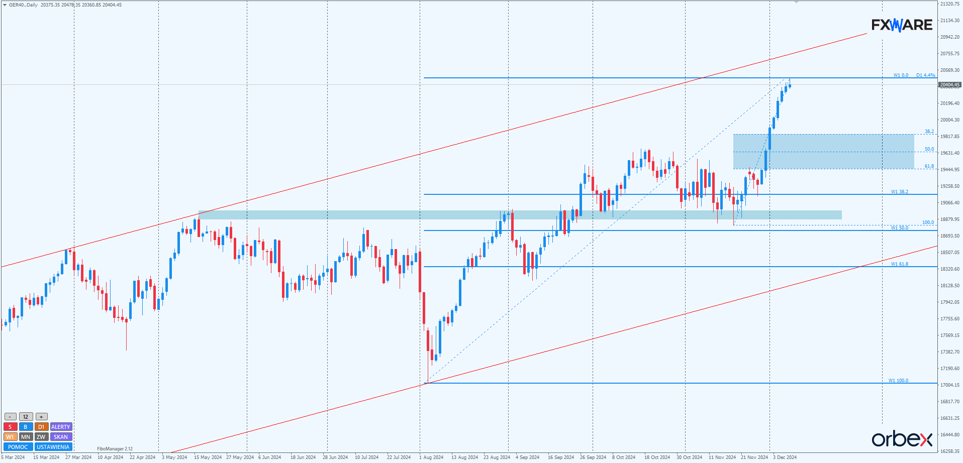 Indeks DAX od blisko 10 sesji rysuje na interwale D1 silny ruch wzrostowy, praktycznie codziennie ustanawiając nowe ATH. Całość tego ruchu pozostaje w blisko rocznym kanale wzrostowym. Nie jest on jednak jednorodny, a ostatnie trzy sesje były nieznacznie wolniejsze. W przypadku wystąpienia korekty, pierwszymi naturalnymi celami będą poziomy zniesień Fibo pomiaru ostatniego impulsu wzrostowego (aktualnie podnoszące się coraz wyżej wraz z ustanawianiem kolejnych ATH, a obecnie przebiegające w okolicach październikowego szczytu). Trend wzrostowy na chwilę obecną wydaje się niezagrożony, choć próba dołączenia do niego teraz może być bardzo ryzykowna dla byków.