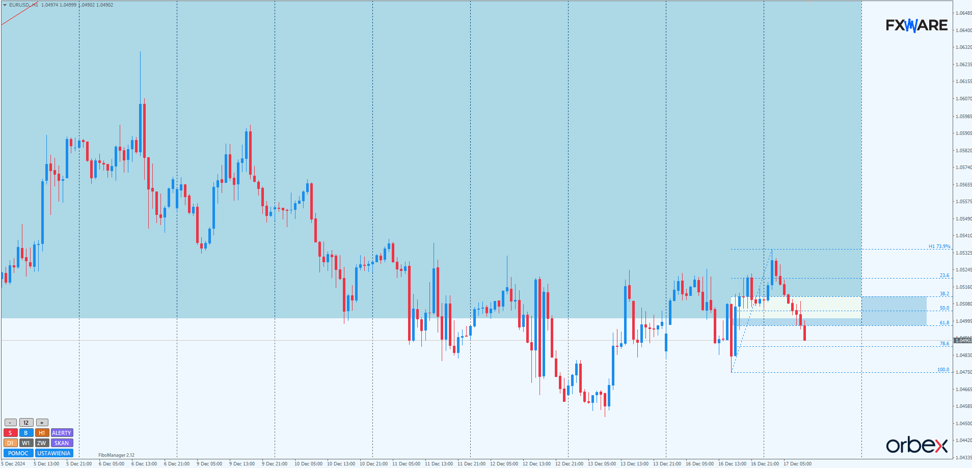 Kurs głównej pary walutowej ciągle pozostaje w konsolidacji. Na wykresie D1 jest ona ograniczona od góry strefą zniesień Fibo swingu spadkowego mierzonego od początku listopada, a od dołu strefą w okolicach 1.042. Do momentu wykreowania kolejnego impulsu, najlepiej z zamknięciem poza opisaną konsolidacją, definitywne przesądzenie o opuszczeniu lub powrocie do strefy jeszcze większej, blisko dwuletniej konsolidacji, jest niemożliwe.