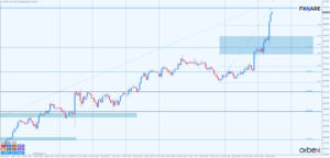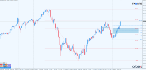 Na wykresie H1 wyraźnie widać to przyspieszenie. W przypadku korekty pamiętajmy, że aktualny pomiar Fibo tego swingu ciągle się jeszcze „naciąga”. Na chwilę obecną strefa interesujących dla byków zniesień przebiega w obszarze 154.500–155.500. W tym obszarze wczoraj i dzisiaj miały miejsce również lokalne konsolidacje.